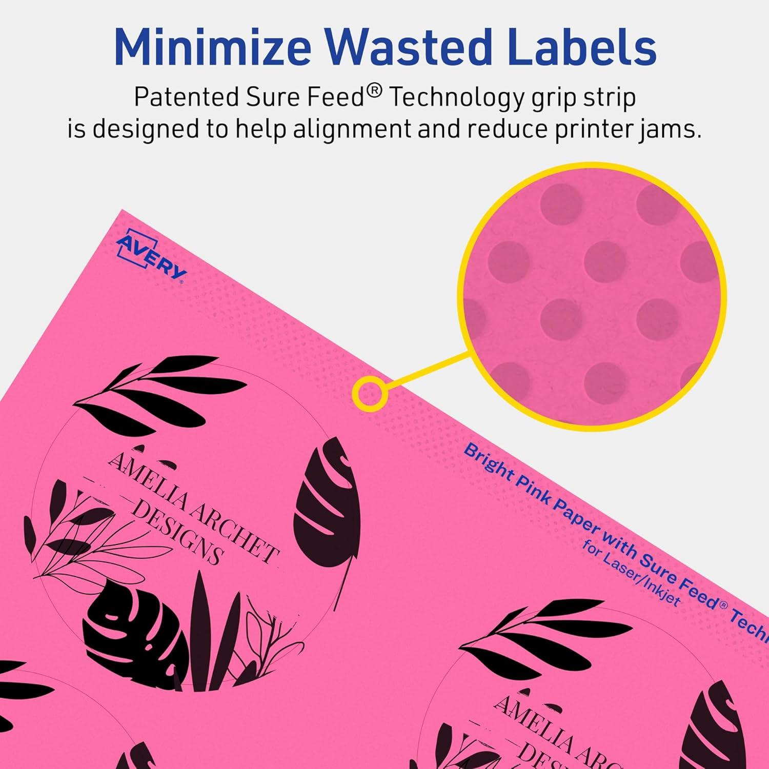 Avery Printable Round Labels, Sure Feed Technology, 3" Diameter, Bright Pink Labels, Print-to-The-Edge, Laser/Inkjet Printable, 60 Total, Great for Soaps and Packaging(240 labels)