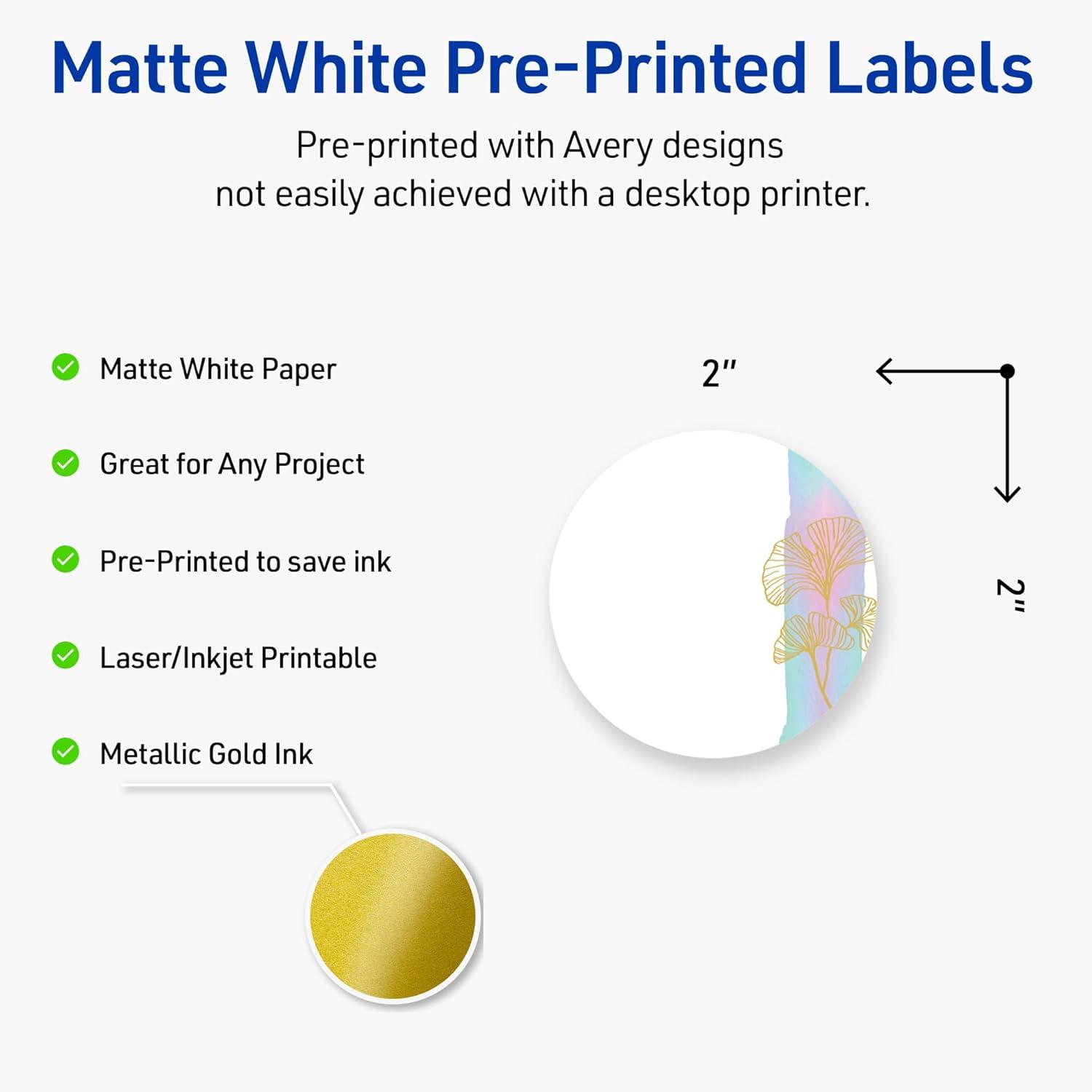 Avery Printable Round Labels, Sure Feed Technology, Gold Dots Edge Design, 2″ Diameter, Matte White Permanent Labels, Laser/Inkjet, 120 Total, Great for Product Merchandising(Watercolors With Gold Ginkgo Leaves)
