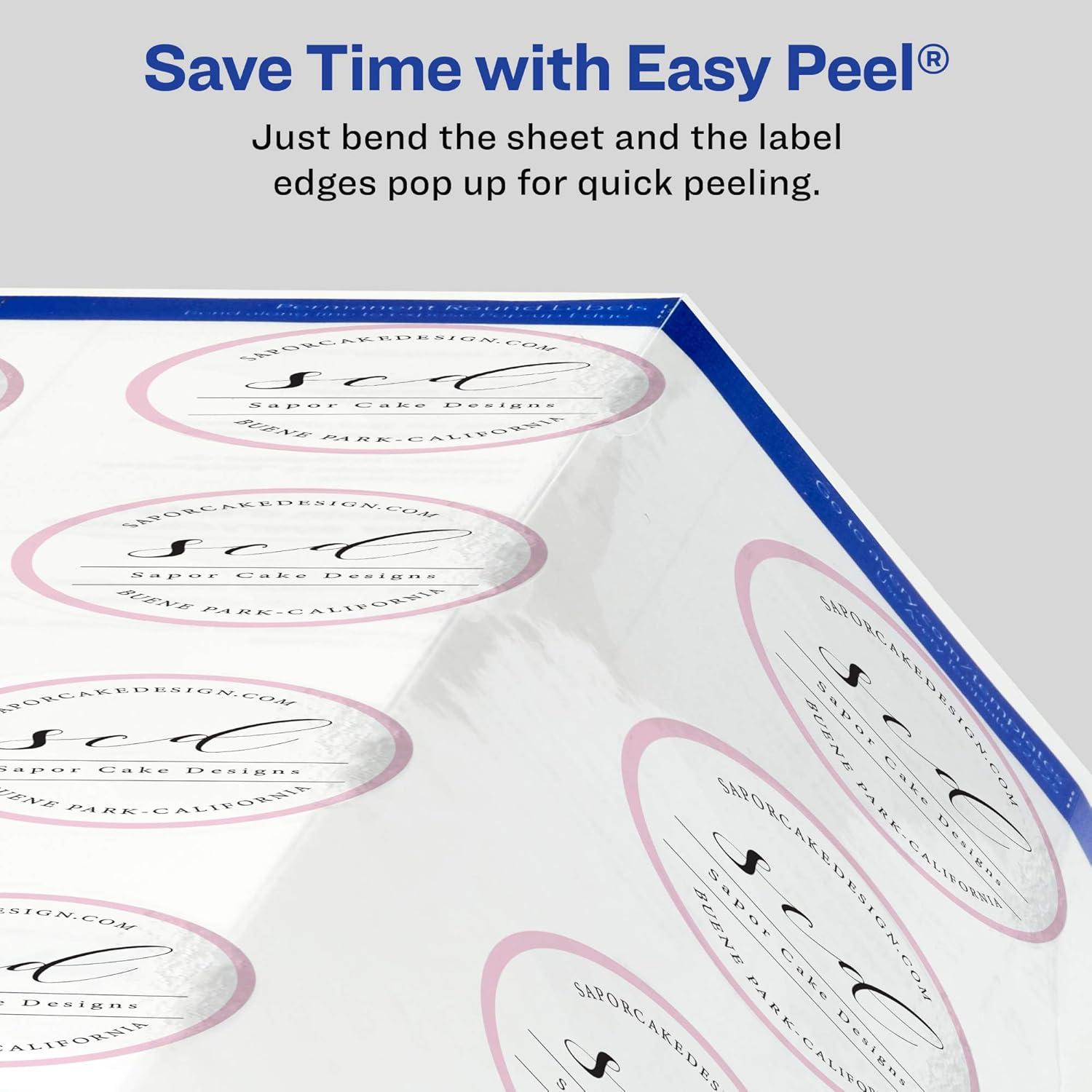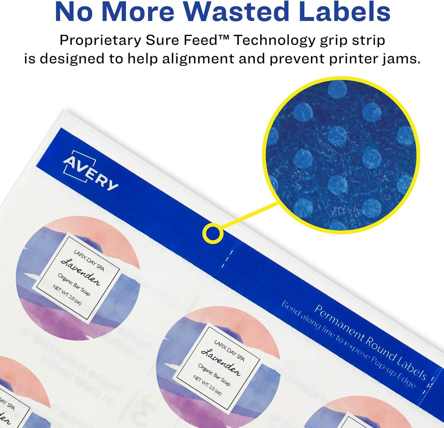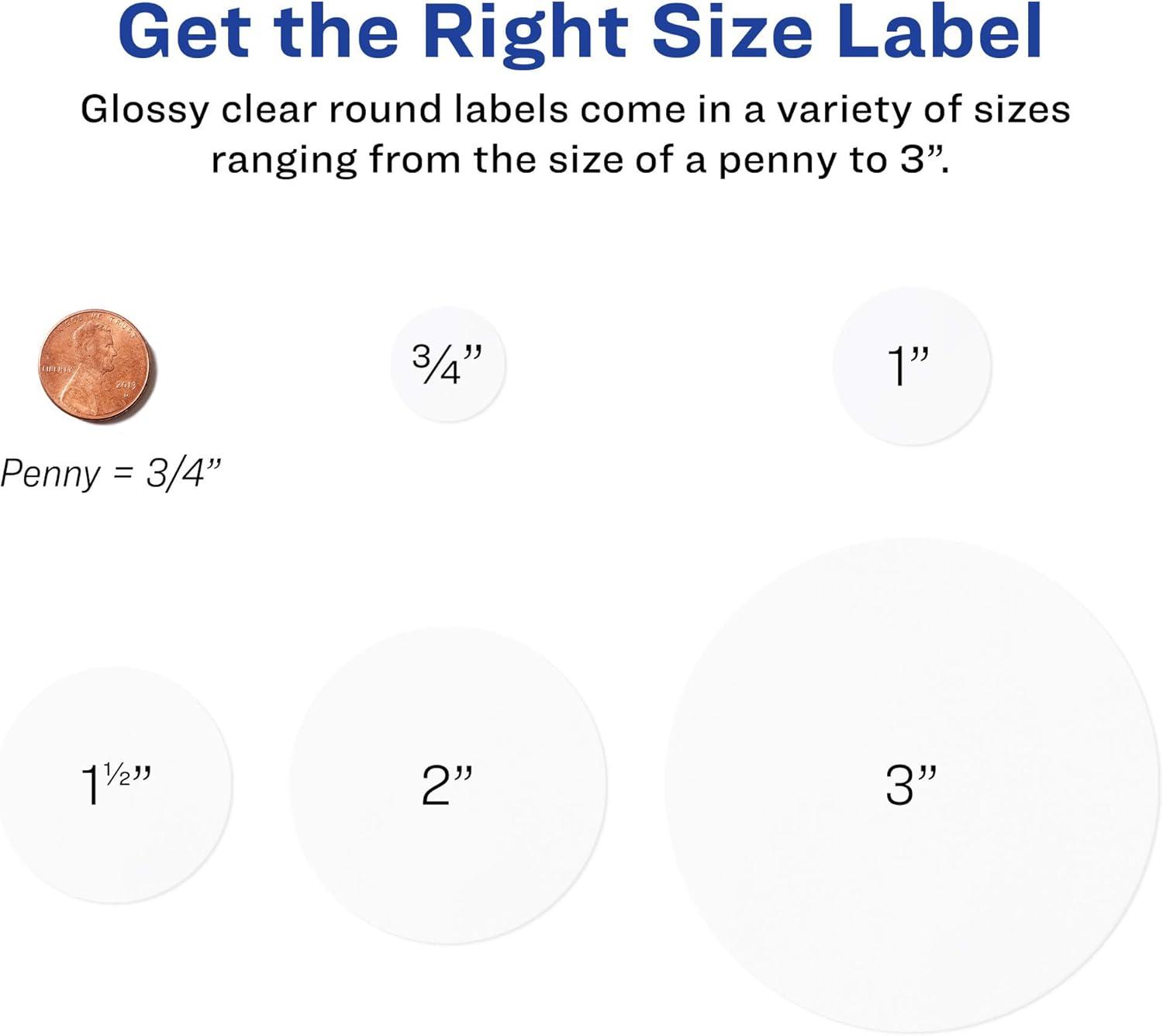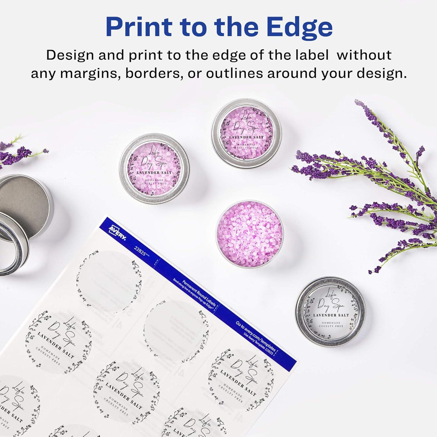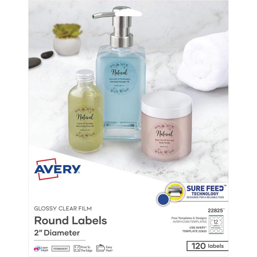 Give your product or handmade gift a custom printed on look with Avery crystal clear round labels, best when applied to white or light colored surfaces. Our print-to-the-edge capability allows you to create bright, eye-catching full-bleed labels with sharp text and crisp images printed right to the edge of the round sticker label with no border or margin. Each sheet of labels features Sure Feed technology which helps deliver a more reliable feed through your printer to prevent print misalignments and paper jams. Our round printable stickers are quick and easy to apply with our patented Easy Peel label sheets with Pop-up Edge. Simply fold the sheet back to display the label edges for convenient and fast peeling that saves time and avoids label waste. A strong permanent adhesive is used to make sure that these labels stick and stay to paper, cardboard, plastic, glass, metal and more, without curling or falling off. Compatible with both laser and inkjet printers. Avery Design & Print makes it easy to create customized labels from your own home or business. The free browser-based software has everything you need to design product labels, gift labels, thank you stickers and packaging labels for candles, soap, cosmetics and more. Try it out today on the Avery site.Try it out today on the Avery site. Try it out today on the Avery site.