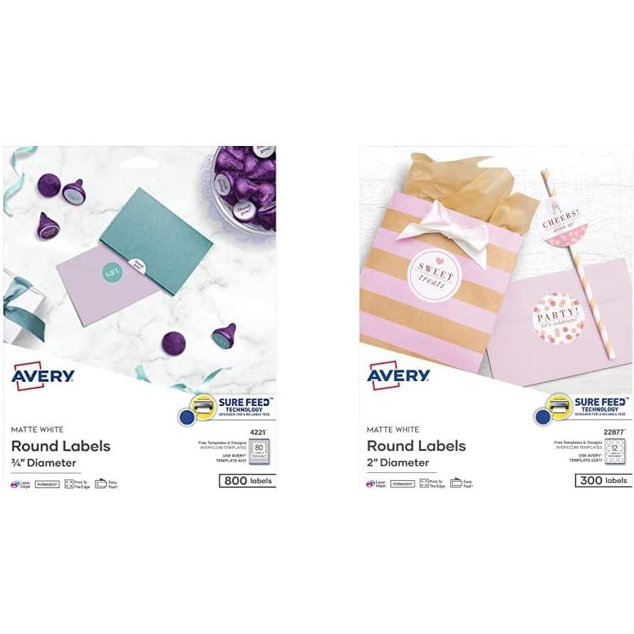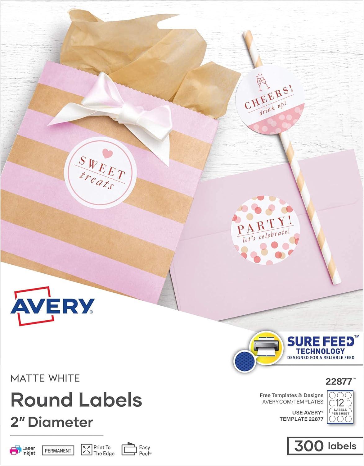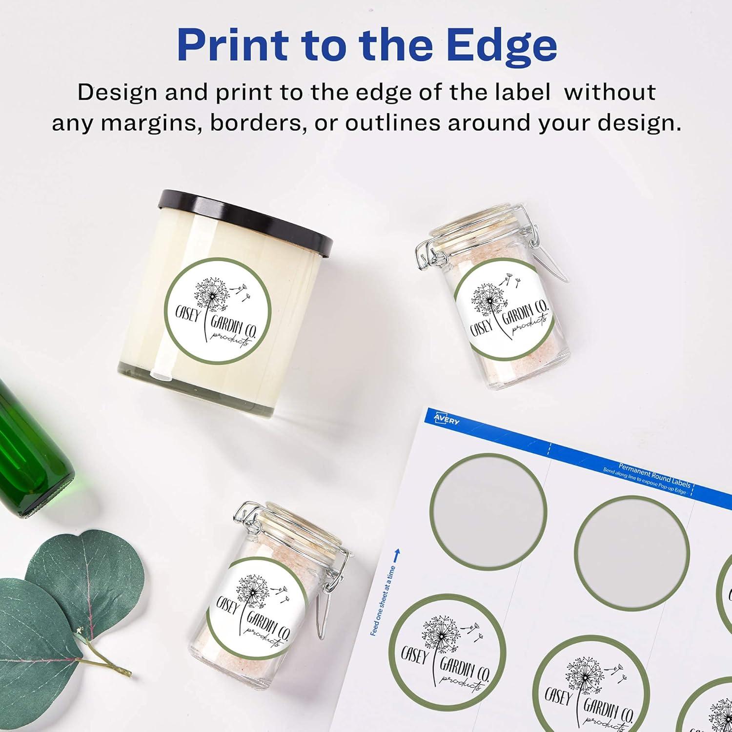 Add a special finishing touch to any product, gift, or personal creation with these professional looking Avery matte white labels. Our print-to-the-edge capability allows you to create bright, eye-catching, full bleed labels with sharp text and crisp images printed right to the edge of the round sticker label with no border or margin. Each sheet of labels features Sure Feed technology which helps deliver a more reliable feed through your printer to prevent print misalignments and paper jams. Our round printable stickers are quick and easy to apply with our patented Easy Peel label sheets with Pop-up Edge. Simply fold the sheet back to display the label edges for convenient and fast peeling that saves time and avoids label waste. A strong permanent adhesive is used to make sure that these small round labels stick and stay to paper, cardboard, plastic, glass, metal and more, without curling or falling off. Compatible with both laser and inkjet printers. Avery Design & Print makes it easy to create customized labels from your own home or business. The free browser-based software has everything you need to design pricing labels, mailing seals, planner stickers and product labels for bath salts, essential oils, beauty products and more. Try it out today on the Avery site.