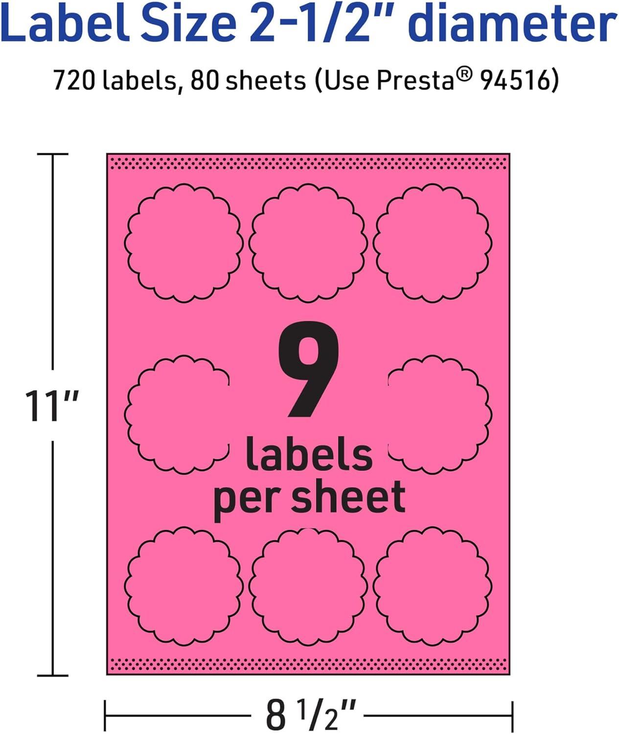 Avery Printable Round Scalloped Labels, Sure Feed Technology, 2-1/2" Diameter, Bright Pink Labels, Print-to-The-Edge, Laser/Inkjet Printable, 90 Total, Great for Mailing Seals and Candles(720 labels)
