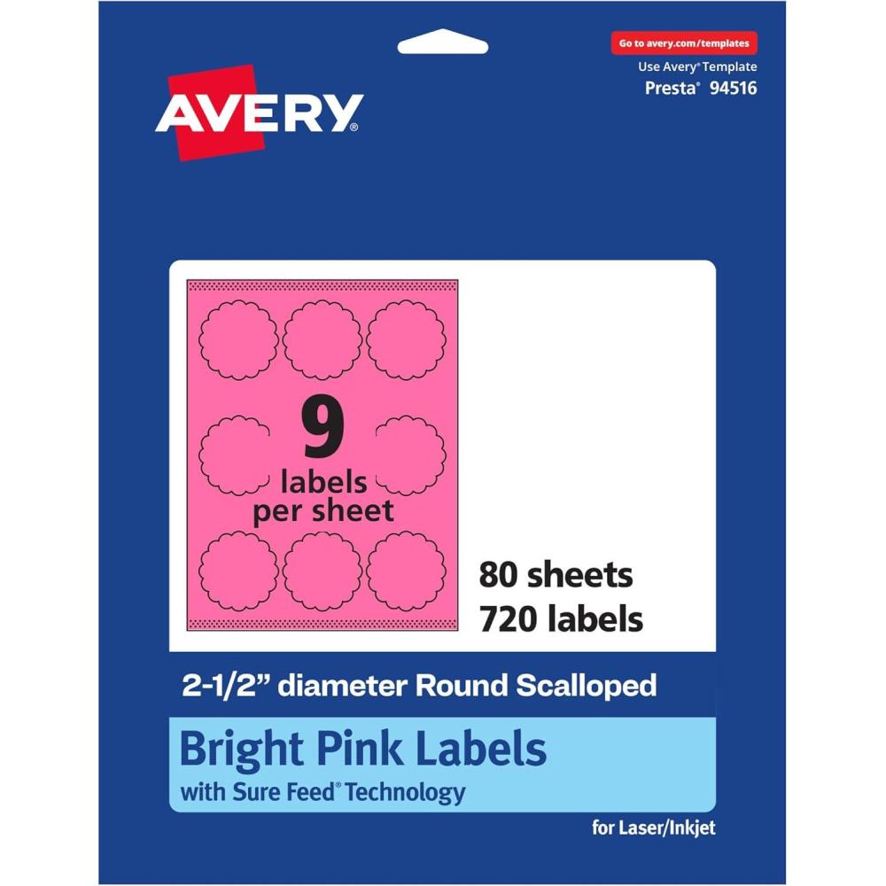 Avery Printable Round Scalloped Labels, Sure Feed Technology, 2-1/2″ Diameter, Bright Pink Labels, Print-to-The-Edge, Laser/Inkjet Printable, 90 Total, Great for Mailing Seals and Candles(720 labels)