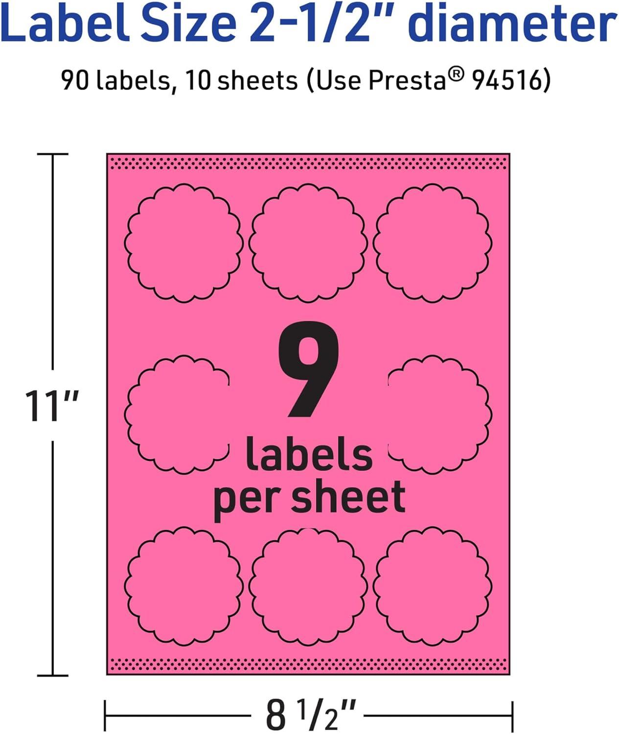 Design your own high-visibility labels with vibrant, bright colors with Avery Bright Pink Round Scalloped 2.5″ Diameter Labels. Created with brilliantly eye-catching bright pink label material, these vivid labels will immediately grab people's attention so that you can easily make your own mailing seals, candle labels, soap labels, and more! The bright color is perfect whether you need to create warnings, organize inventory, or make sure your product labels stand out on a shelf. Colored labels also help you reduce printing costs by printing with black ink instead of printing color ink on white paper. Compatible with both laser and inkjet printers, these labels make it easy to design professional labels with your own home or office printer. The print-to-the-edge layout allows you to create full-bleed artwork that allows the bright label color to peek through gaps in your design and it also lets you add in borders that fill the edges without any empty spaces. Easily customize product labels, round spice labels, mason jar labels, and more with your own logos, art, symbols, and messaging by using the templates and designs in Avery Design & Print on the Avery site.