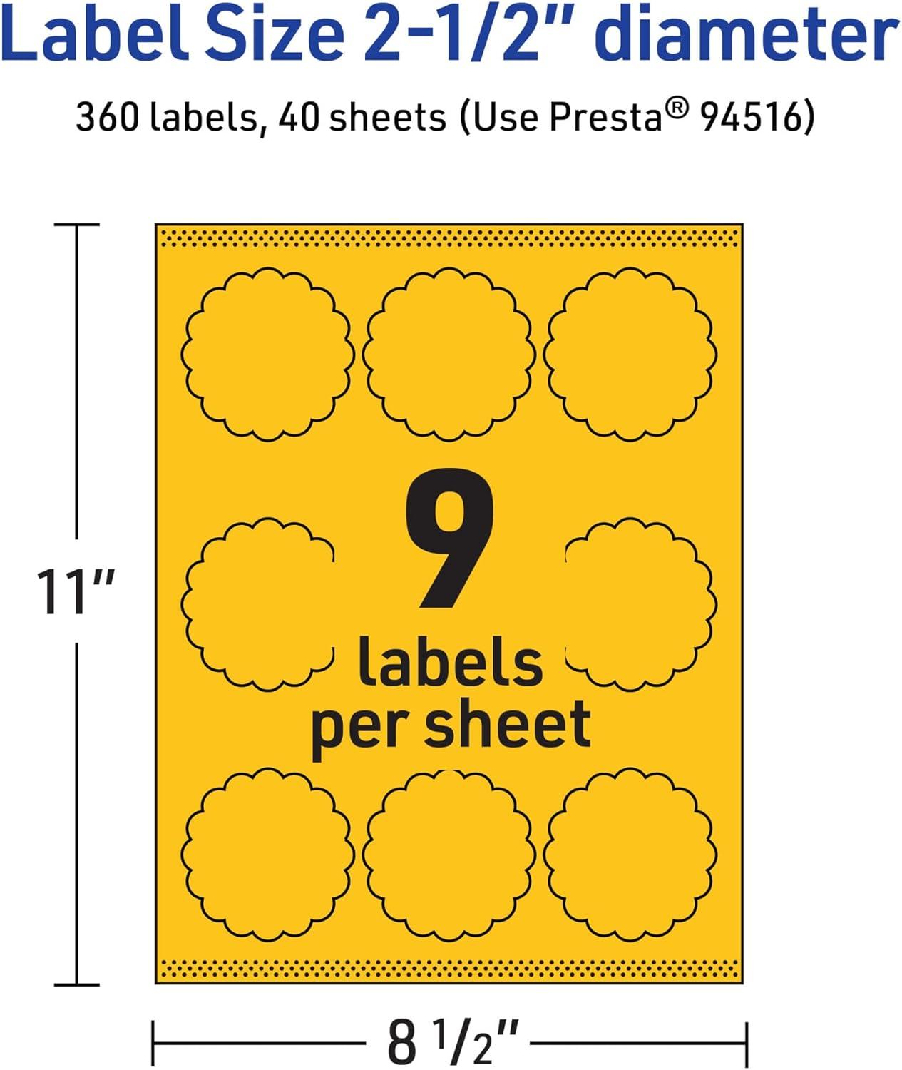 Avery Printable Round Scalloped Labels, Sure Feed Technology, 2-1/2″ Diameter, Bright Yellow Labels, Print-to-The-Edge, Laser/Inkjet Printable, 90 Total, Great for Mailing Seals and Candles(360 labels)