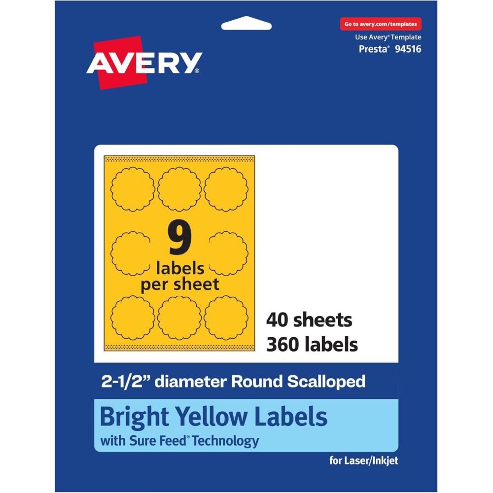 Avery Printable Round Scalloped Labels, Sure Feed Technology, 2-1/2" Diameter, Bright Yellow Labels, Print-to-The-Edge, Laser/Inkjet Printable, 90 Total, Great for Mailing Seals and Candles(360 labels)