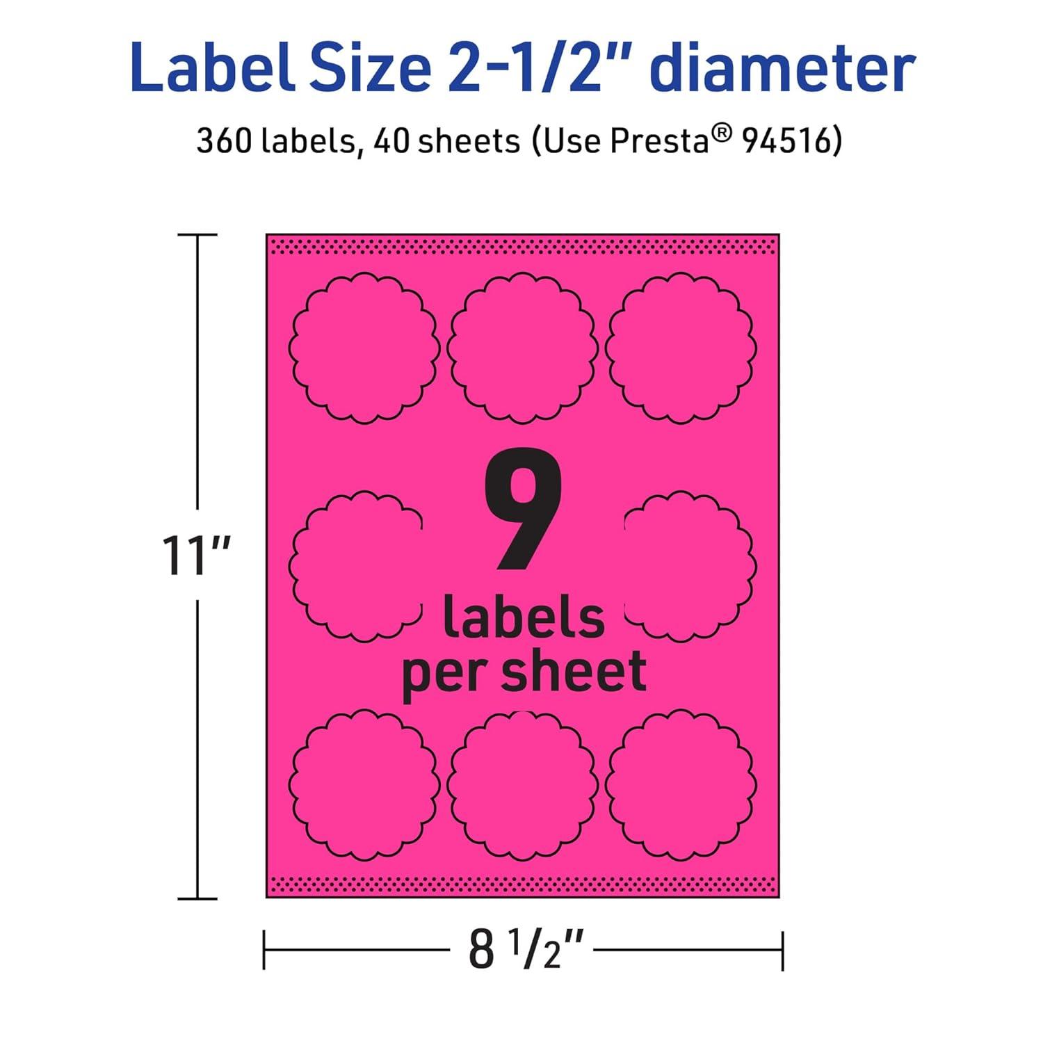 Avery Printable Round Scalloped Labels, Sure Feed Technology, 2-1/2" Diameter, Neon Magenta Labels, Print-to-The-Edge, Laser/Inkjet Printable, 180 Total, Great for Mailing Seals and Candles(360 labels)