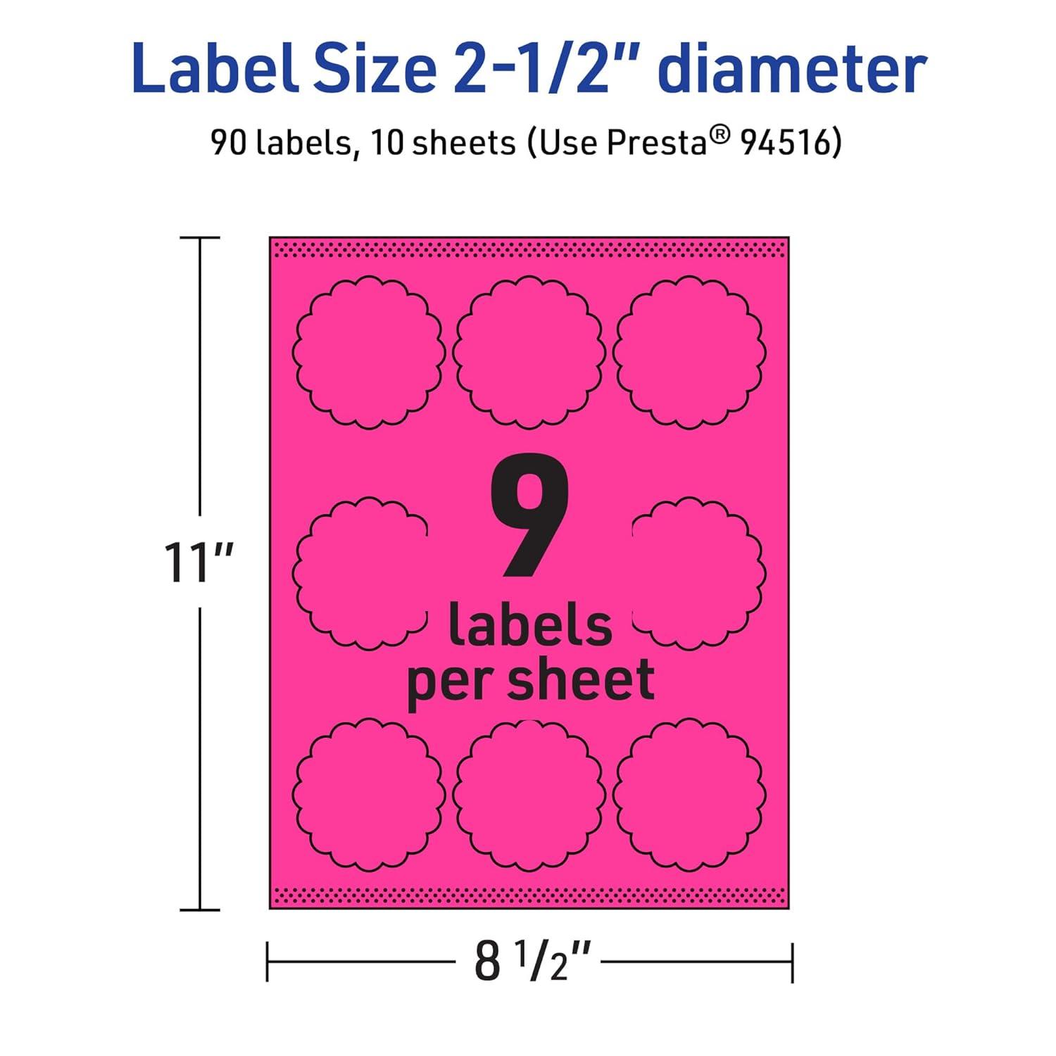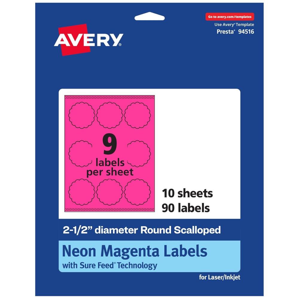 Design your own high-visibility labels with vibrant, bright colors with Avery Neon Magenta Round Scalloped 2.5″ Diameter Labels. Created with brilliantly eye-catching neon magenta label material, these vivid labels will immediately grab people's attention so that you can easily make your own mailing seals, candle labels, soap labels, and more! The fluorescent color is perfect whether you need to create warnings, organize inventory, or make sure your product labels stand out on a shelf. Colored labels also help you reduce printing costs by printing with black ink instead of printing color ink on white paper. Compatible with both laser and inkjet printers, these labels make it easy to design professional labels with your own home or office printer. The print-to-the-edge layout allows you to create full-bleed artwork that allows the bright label color to peek through gaps in your design and it also lets you add in borders that fill the edges without any empty spaces. Easily customize product labels, round spice labels, mason jar labels, and more with your own logos, art, symbols, and messaging by using the templates and designs in Avery Design & Print on the Avery site.