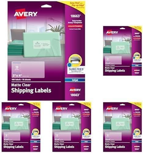 Do your envelopes and packages need a shot of sophistication? This pack of 100 Avery Matte Clear Shipping Labels is the clear solution to sprucing up ordinary mailing and packaging. These matte clear labels virtually disappear when applied to white, textured or light-colored paper. Use these clear labels on glassine bags and vellum envelopes to create a perfect, printed-on appearance. These labels also feature exclusive Avery Sure Feed technology to improve print alignment and avoid jamming. The blue, textured strip on the top of each sheet provides better grip for printer rollers and helps feed the sheet through your printer. Ultrahold permanent adhesive ensures that these labels stick and stay without curling, peeling or falling off. Once applied, the permanent adhesive will make sure the label holds fast to multiple surfaces including paper, cardboard, plastic, glass, film and painted metals. The patented Easy Peel label design makes these clear address labels easy to peel and quick to apply. Just bend the label sheet, peel off your labels and fold the sheet back flat. These easy-to-use Avery mailing labels make it simple to personalize your envelopes and shipping boxes with an elegant flair. Avery Design & Print also makes it effortless to create beautiful, personalized labels from your own home or business. The free browser-based software has everything you need to design address labels, invitations, product packaging and more. Try it out today on the Avery site