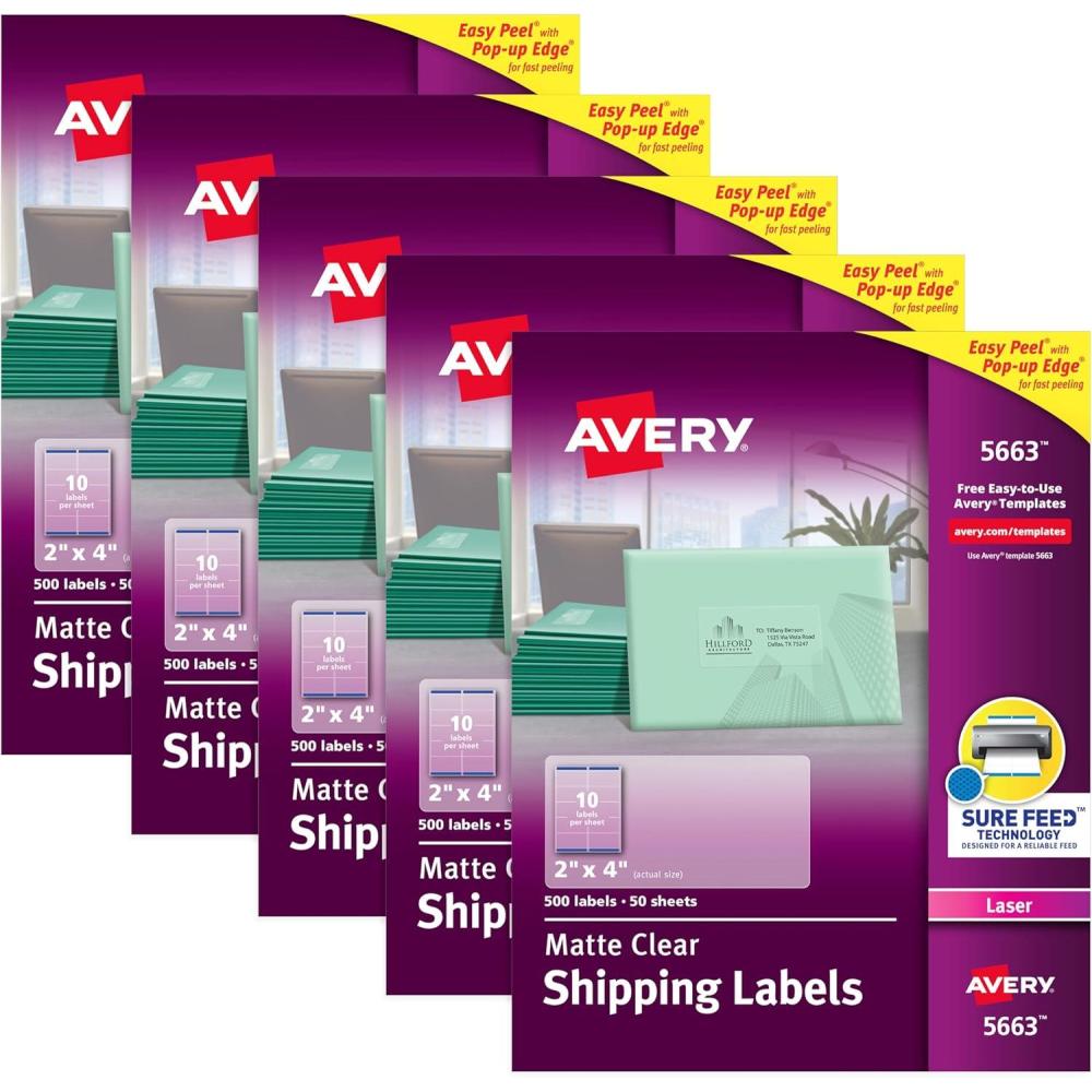 Do your envelopes and packages need a shot of sophistication? This pack of 500 Avery Matte Clear Shipping Address Labels is the clear solution to sprucing up ordinary mailing and packaging. These matte clear labels virtually disappear when applied to white, textured or light-colored paper. Use these clear labels on glassine bags and vellum envelopes to create a perfect, printed-on appearance. Sure Feed(R) technology reduces jams or smudges by creating a more reliable feed through your printer. The blue, textured strip on the top of each sheet provides better grip for printer rollers and helps feed the sheet through your printer. Ultrahold permanent adhesive ensures that these labels stick and stay without curling, peeling or falling off. Once applied, the permanent adhesive will make sure the label holds fast to multiple surfaces including paper, cardboard, plastic, glass, film and painted metals. The patented Easy Peel label design makes these clear shipping mailing labels easy to peel and quick to apply. Just bend the label sheet, peel off your labels and fold the sheet back flat. These easy-to-use Avery mailing labels make it simple to personalize your envelopes and shipping boxes with an elegant flair. Avery Design & Print also makes it effortless to create beautiful, personalized labels from your own home or business. The free browser-based software has everything you need to design address labels, invitations, product packaging and more. Try it out today on the Avery site Please Note: These labels are optimized for use with laser printers only. Using these sheets with inkjet printers may cause the print to smear.