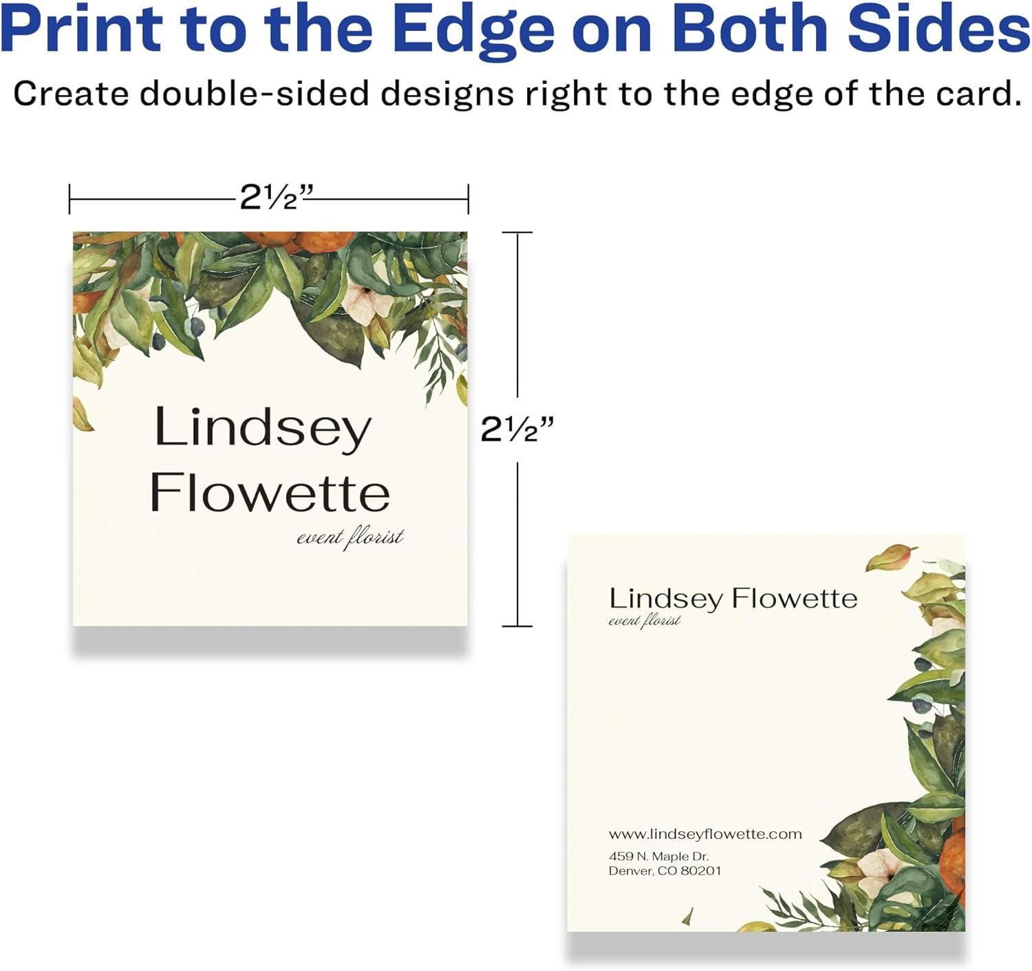 Easily create your own customized cards with Avery Ivory 2-1/2″ x 2-1/2″ Square Cards. Enhance business cards, insert cards, thank you cards, and more with the high-quality appearance of Avery premium ivory cardstock. Stand out from standard rectangle cards with square business cards, table cards, seating cards, coupon cards, appointment cards, loyalty cards, and more. Created with heavyweight and durable 80lb / 216GSM ivory cardstock, the ivory material is a versatile fit for any project or event. Printable on both sides, compatible with laser and inkjet printers, and featuring a print-to-the-edge layout, the cards let you create professional designs that let you print all the way to the edge. Avery square cards are carefully constructed with patented features to provide the best results. Sure Feed technology reduces jams or smudges by creating a more reliable feed through your printer. Easily customize cards with your own logos, art, symbols, and messaging by using the templates and designs in Avery Design & Print on the Avery site.