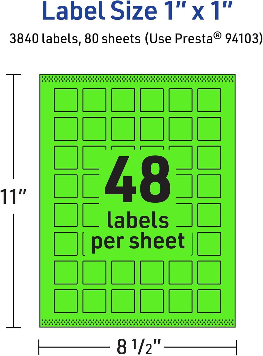 Design your own high-visibility labels with vibrant, bright colors with Avery Neon Green Square 1″ x 1″ Labels. Created with brilliantly eye-catching neon green label material, these vivid labels will immediately grab people's attention so that you can easily make your own soap labels, QR code labels, ingredient labels, canning labels, and more! The fluorescent color is perfect whether you need to create warnings, organize inventory, or make sure your product labels stand out on a shelf. Colored labels also help you reduce printing costs by printing with black ink instead of printing color ink on white paper. Compatible with both laser and inkjet printers, these labels make it easy to design professional labels with your own home or office printer. The print-to-the-edge layout allows you to create full-bleed artwork that allows the bright label color to peek through gaps in your design and it also lets you add in borders that fill the edges without any empty spaces. Easily customize candle labels, pricing labels, product labels, and more with your own logos, art, symbols, and messaging by using the templates and designs in Avery Design & Print on the Avery site.