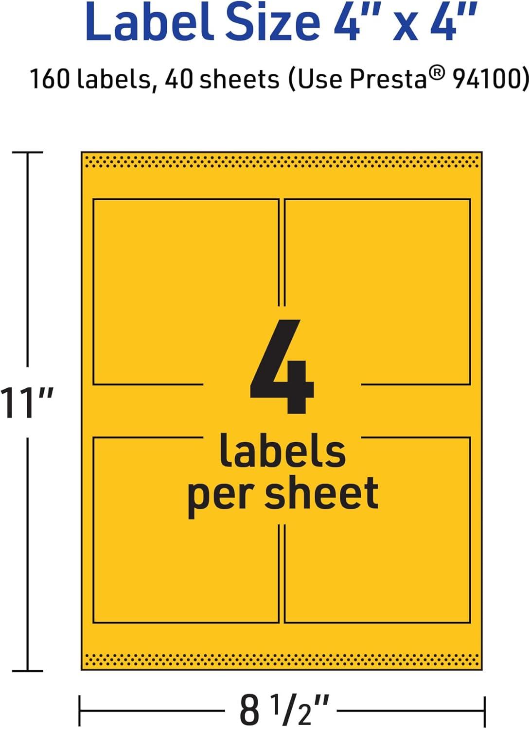 Avery Printable Square Labels, Sure Feed Technology, 4″ x 4″, Bright Yellow Labels, Laser/Inkjet Printable, 40 Total, Great for Packaging and Ingredients(160 labels)