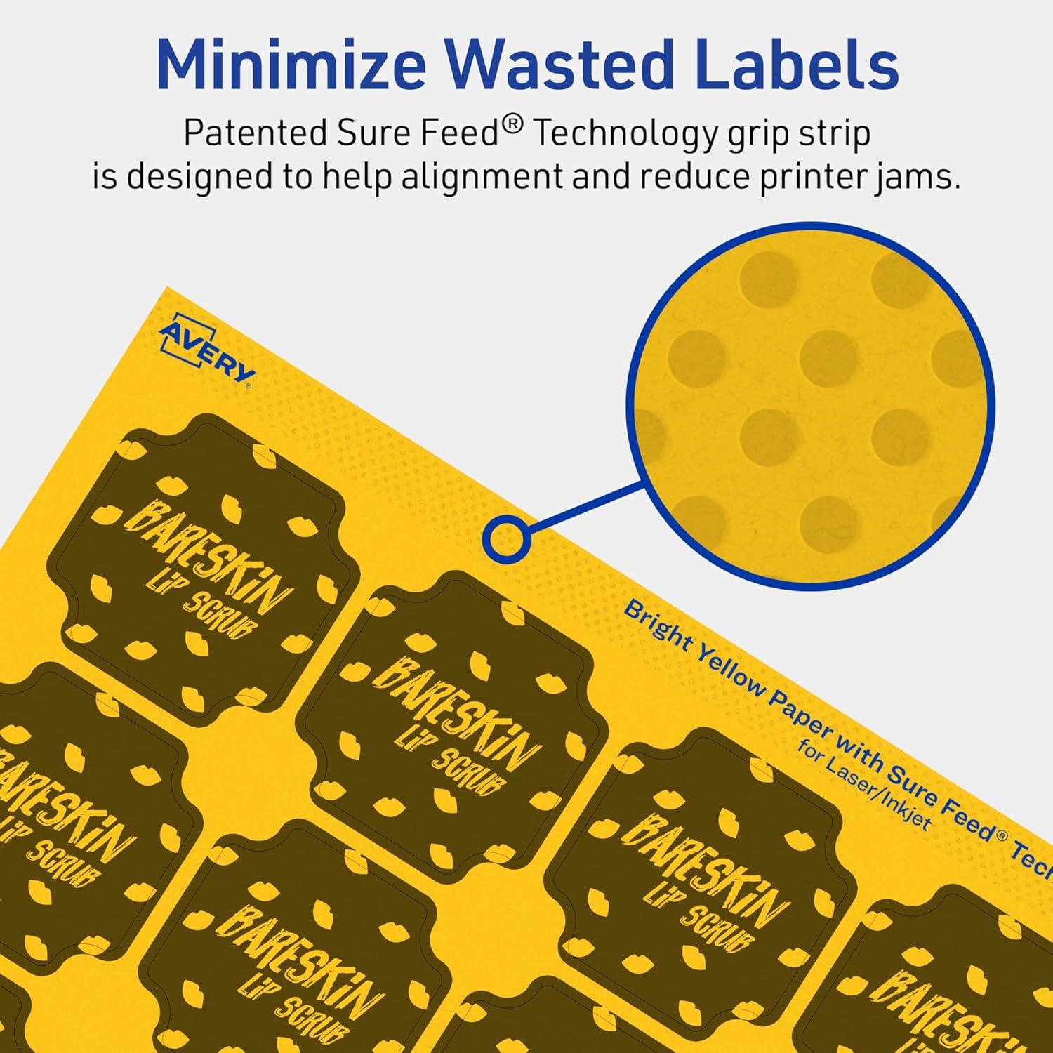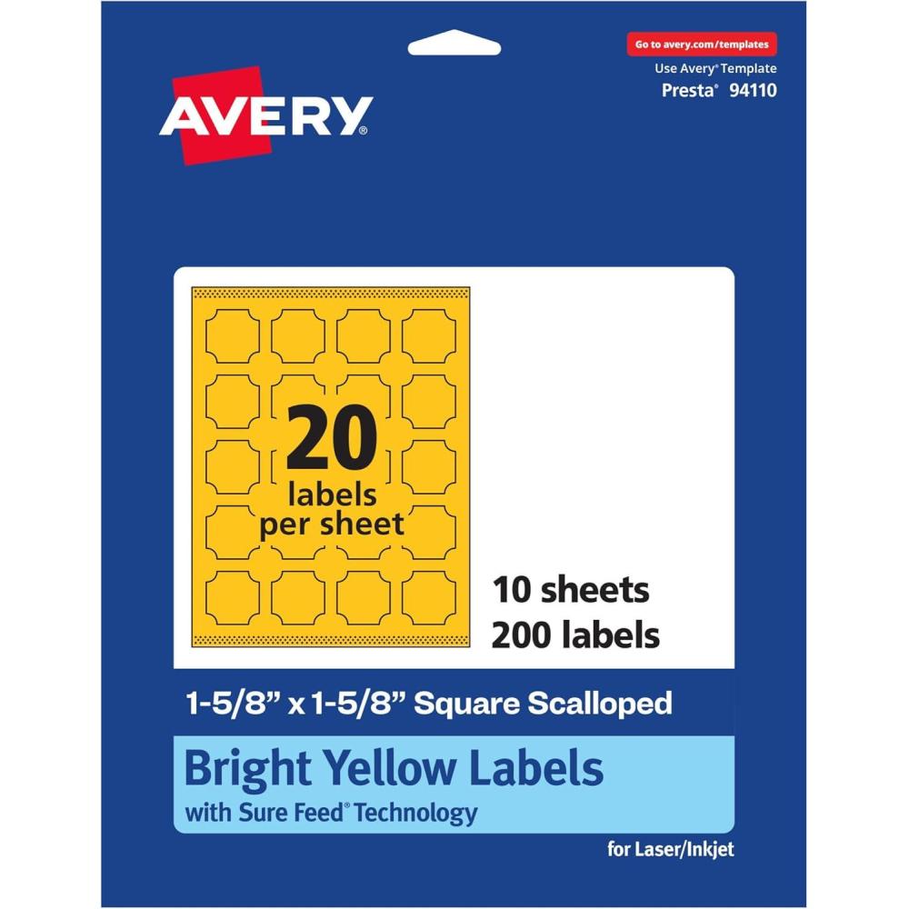 Design your own high-visibility labels with vibrant, bright colors with Avery Bright Yellow Square Scalloped 1-5/8″ x 1-5/8″ Labels. Created with brilliantly eye-catching bright yellow label material, these vivid labels will immediately grab people's attention so that you can easily make your own soap labels, canning labels, ingredient labels, mason jar labels, and more! The bright color is perfect whether you need to create warnings, organize inventory, or make sure your product labels stand out on a shelf. Colored labels also help you reduce printing costs by printing with black ink instead of printing color ink on white paper. Compatible with both laser and inkjet printers, these labels make it easy to design professional labels with your own home or office printer. The print-to-the-edge layout allows you to create full-bleed artwork that allows the bright label color to peek through gaps in your design and it also lets you add in borders that fill the edges without any empty spaces. Easily customize candle labels, product labels, packaging labels, and more with your own logos, art, symbols, and messaging by using the templates and designs in Avery Design & Print on the Avery site.