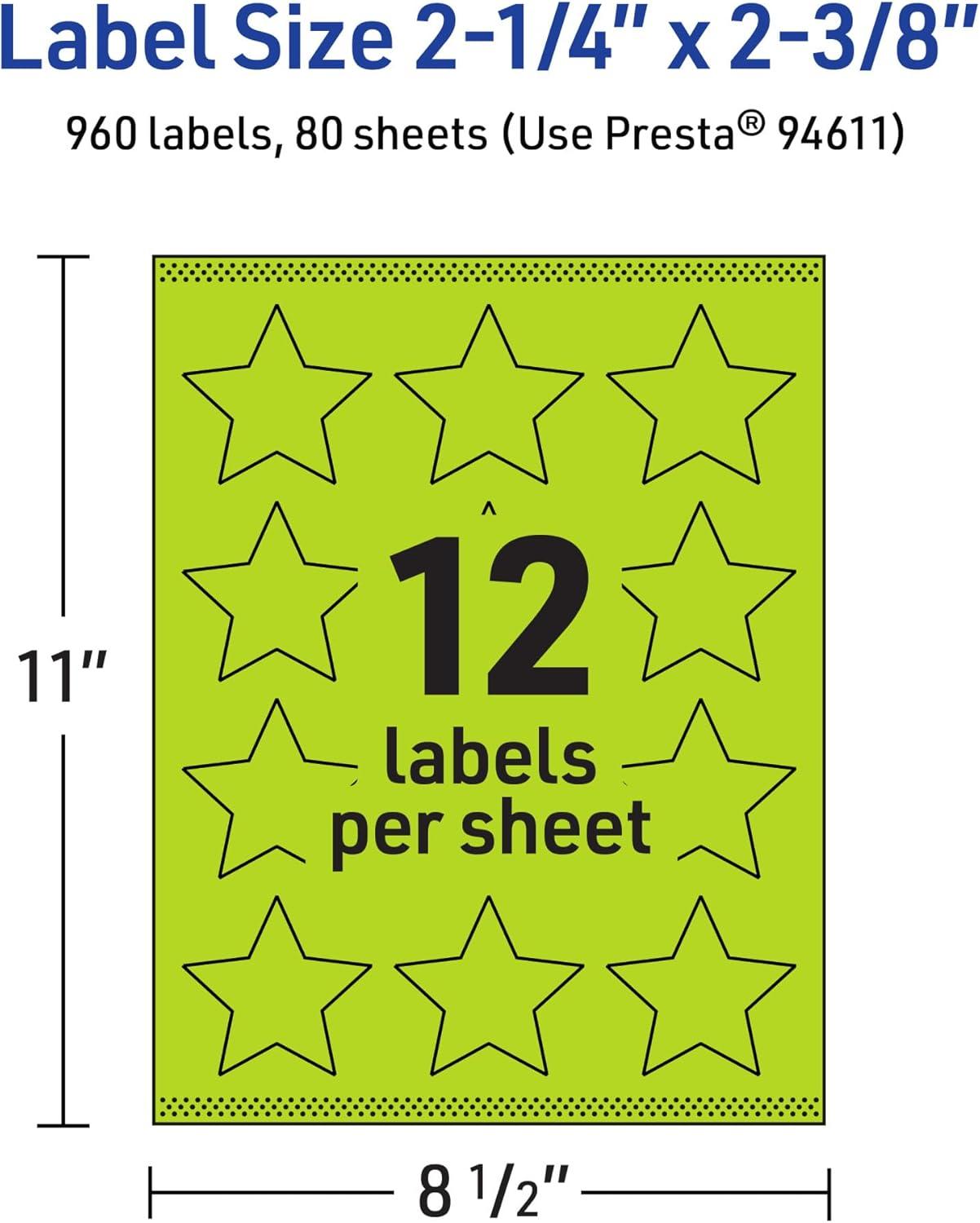 Design your own high-visibility labels with vibrant, bright colors with Avery Bright Green Star 2-1/4″ x 2-3/8″ Labels. Created with brilliantly eye-catching bright green label material, these vivid labels will immediately grab people's attention so that you can easily make your own reward stickers, decorative labels, mailing seals, packaging labels, planner stickers, and more! The bright color is perfect whether you need to create warnings, organize inventory, or make sure your product labels stand out on a shelf. Colored labels also help you reduce printing costs by printing with black ink instead of printing color ink on white paper. Compatible with both laser and inkjet printers, these labels make it easy to design professional labels with your own home or office printer. The print-to-the-edge layout allows you to create full-bleed artwork that allows the bright label color to peek through gaps in your design and it also lets you add in borders that fill the edges without any empty spaces. Easily customize stickers, product labels, pricing labels, and more with your own logos, art, symbols, and messaging by using the templates and designs in Avery Design & Print on the Avery site.