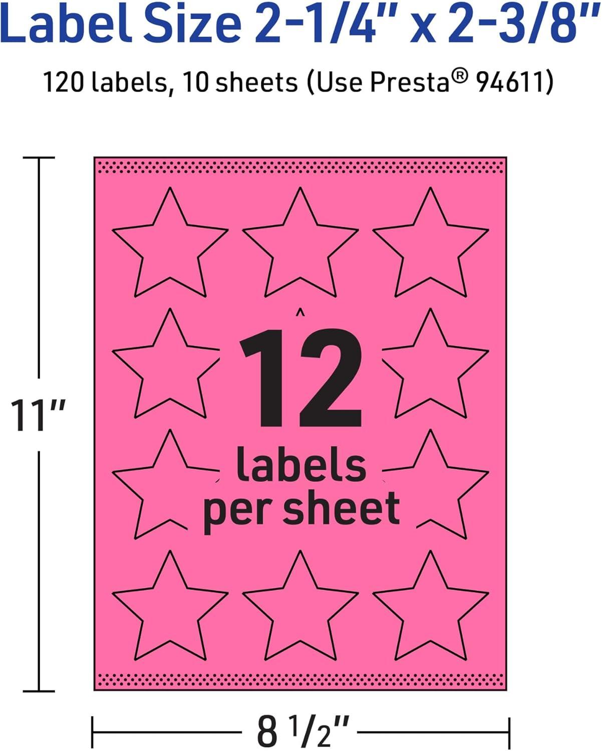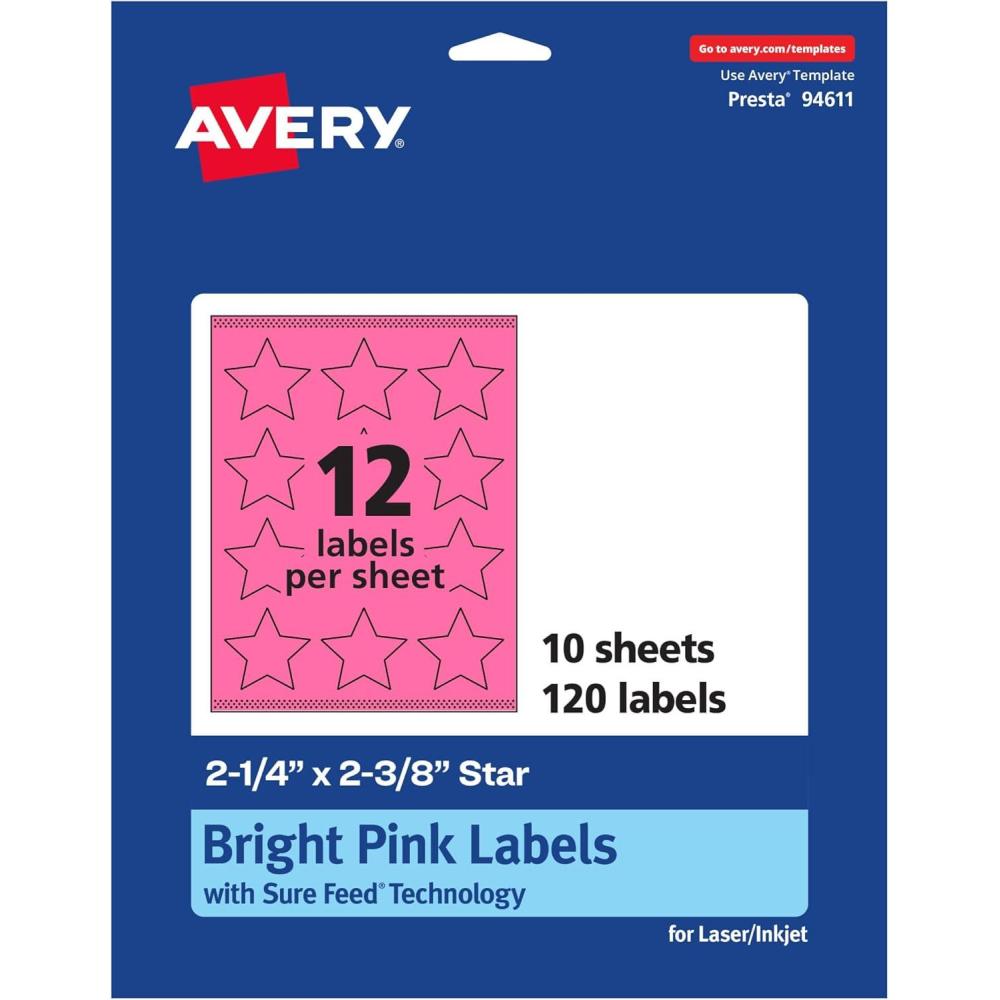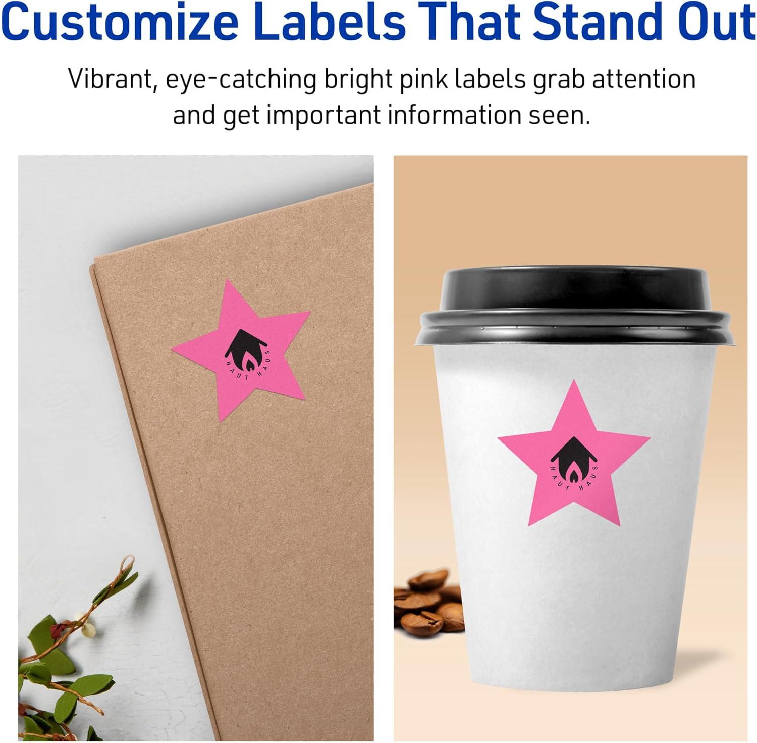 Design your own high-visibility labels with vibrant, bright colors with Avery Bright Pink Star 2-1/4″ x 2-3/8″ Labels. Created with brilliantly eye-catching bright pink label material, these vivid labels will immediately grab people's attention so that you can easily make your own reward stickers, decorative labels, mailing seals, packaging labels, planner stickers, and more! The bright color is perfect whether you need to create warnings, organize inventory, or make sure your product labels stand out on a shelf. Colored labels also help you reduce printing costs by printing with black ink instead of printing color ink on white paper. Compatible with both laser and inkjet printers, these labels make it easy to design professional labels with your own home or office printer. The print-to-the-edge layout allows you to create full-bleed artwork that allows the bright label color to peek through gaps in your design and it also lets you add in borders that fill the edges without any empty spaces. Easily customize stickers, product labels, pricing labels, and more with your own logos, art, symbols, and messaging by using the templates and designs in Avery Design & Print on the Avery site.