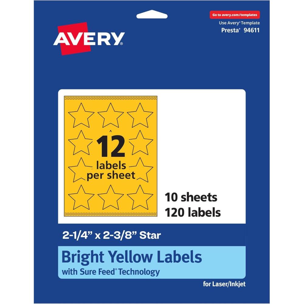 Avery Printable Star Labels, Sure Feed Technology, 2-1/4″ x 2-3/8″, Bright Yellow Labels, Print-to-The-Edge, Laser/Inkjet, 120 Total, Great for Reward Stickers and Mailing Seals(120 labels)