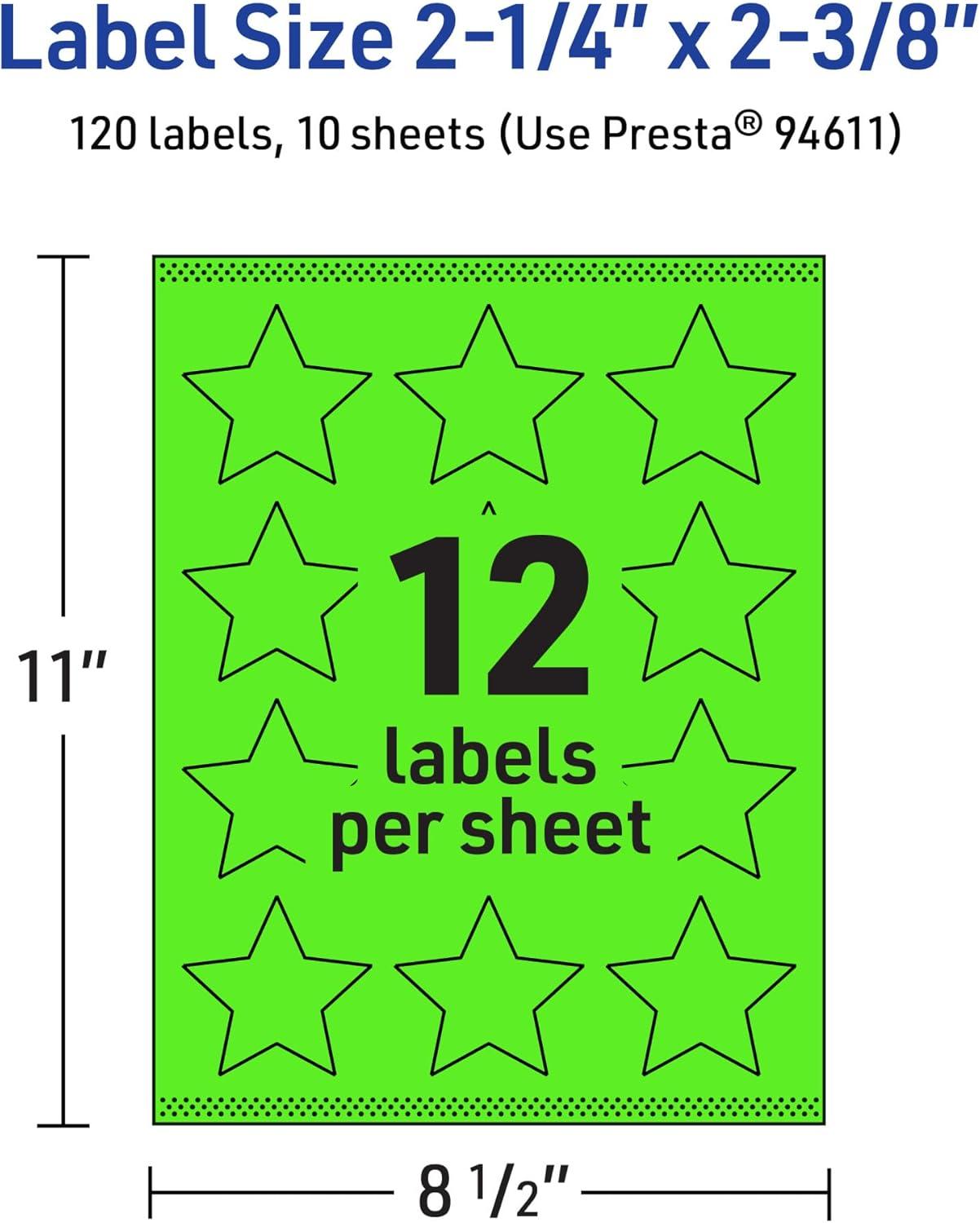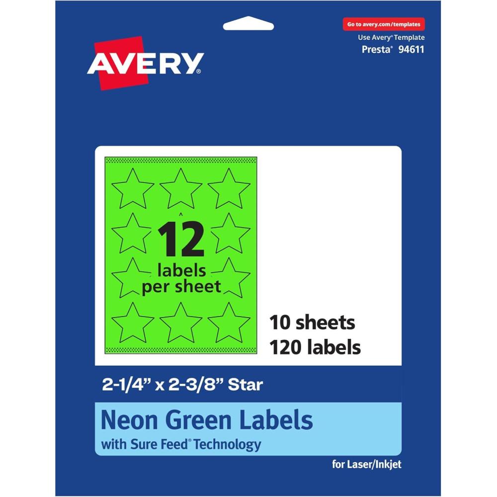 Design your own high-visibility labels with vibrant, bright colors with Avery Neon Green Star 2-1/4″ x 2-3/8″ Labels. Created with brilliantly eye-catching neon green label material, these vivid labels will immediately grab people's attention so that you can easily make your own reward stickers, decorative labels, mailing seals, packaging labels, planner stickers, and more! The fluorescent color is perfect whether you need to create warnings, organize inventory, or make sure your product labels stand out on a shelf. Colored labels also help you reduce printing costs by printing with black ink instead of printing color ink on white paper. Compatible with both laser and inkjet printers, these labels make it easy to design professional labels with your own home or office printer. The print-to-the-edge layout allows you to create full-bleed artwork that allows the bright label color to peek through gaps in your design and it also lets you add in borders that fill the edges without any empty spaces. Easily customize stickers, product labels, pricing labels, and more with your own logos, art, symbols, and messaging by using the templates and designs in Avery Design & Print on the Avery site.