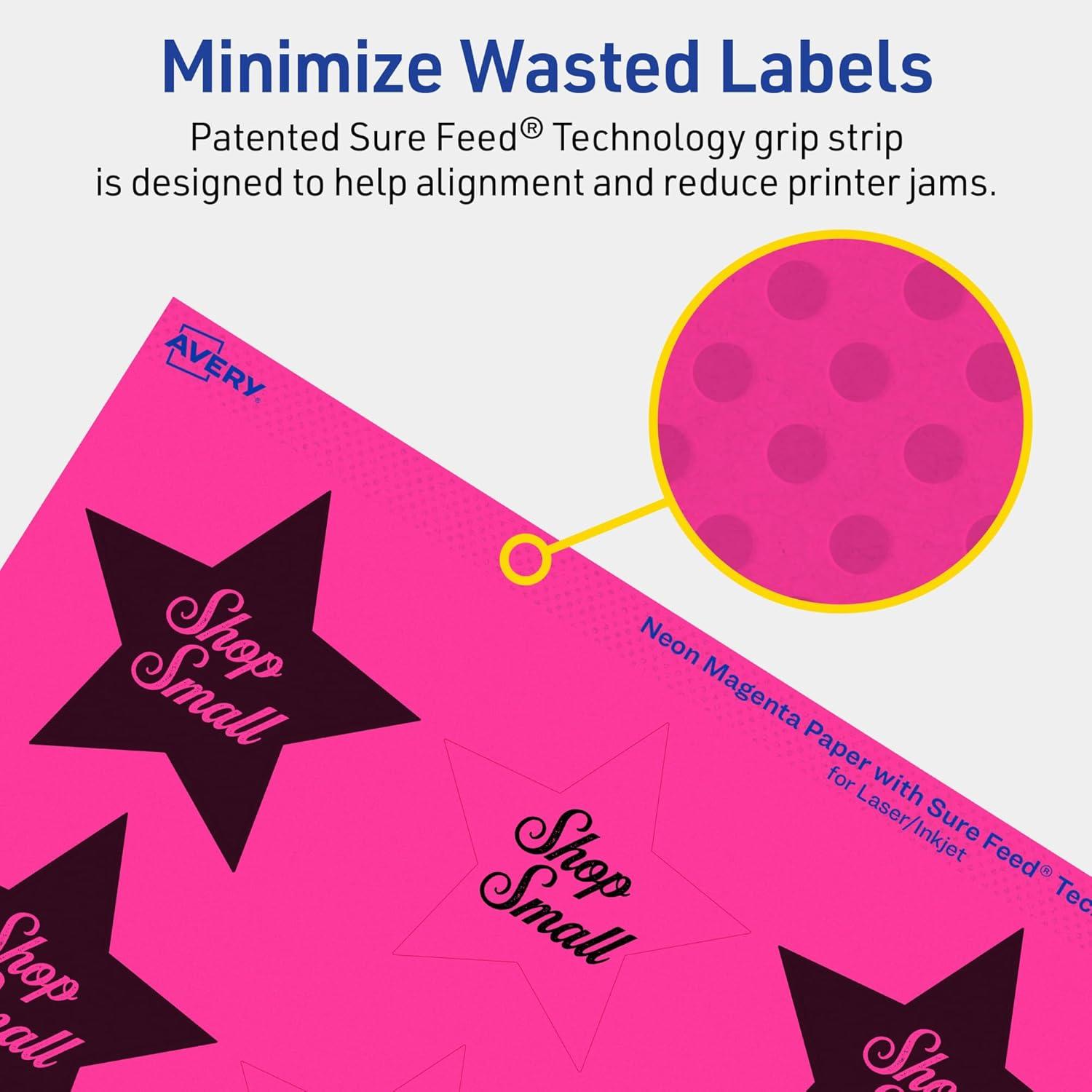 Design your own high-visibility labels with vibrant, bright colors with Avery Neon Magenta Star 2-1/4″ x 2-3/8″ Labels. Created with brilliantly eye-catching neon magenta label material, these vivid labels will immediately grab people's attention so that you can easily make your own reward stickers, decorative labels, mailing seals, packaging labels, planner stickers, and more! The fluorescent color is perfect whether you need to create warnings, organize inventory, or make sure your product labels stand out on a shelf. Colored labels also help you reduce printing costs by printing with black ink instead of printing color ink on white paper. Compatible with both laser and inkjet printers, these labels make it easy to design professional labels with your own home or office printer. The print-to-the-edge layout allows you to create full-bleed artwork that allows the bright label color to peek through gaps in your design and it also lets you add in borders that fill the edges without any empty spaces. Easily customize stickers, product labels, pricing labels, and more with your own logos, art, symbols, and messaging by using the templates and designs in Avery Design & Print on the Avery site.