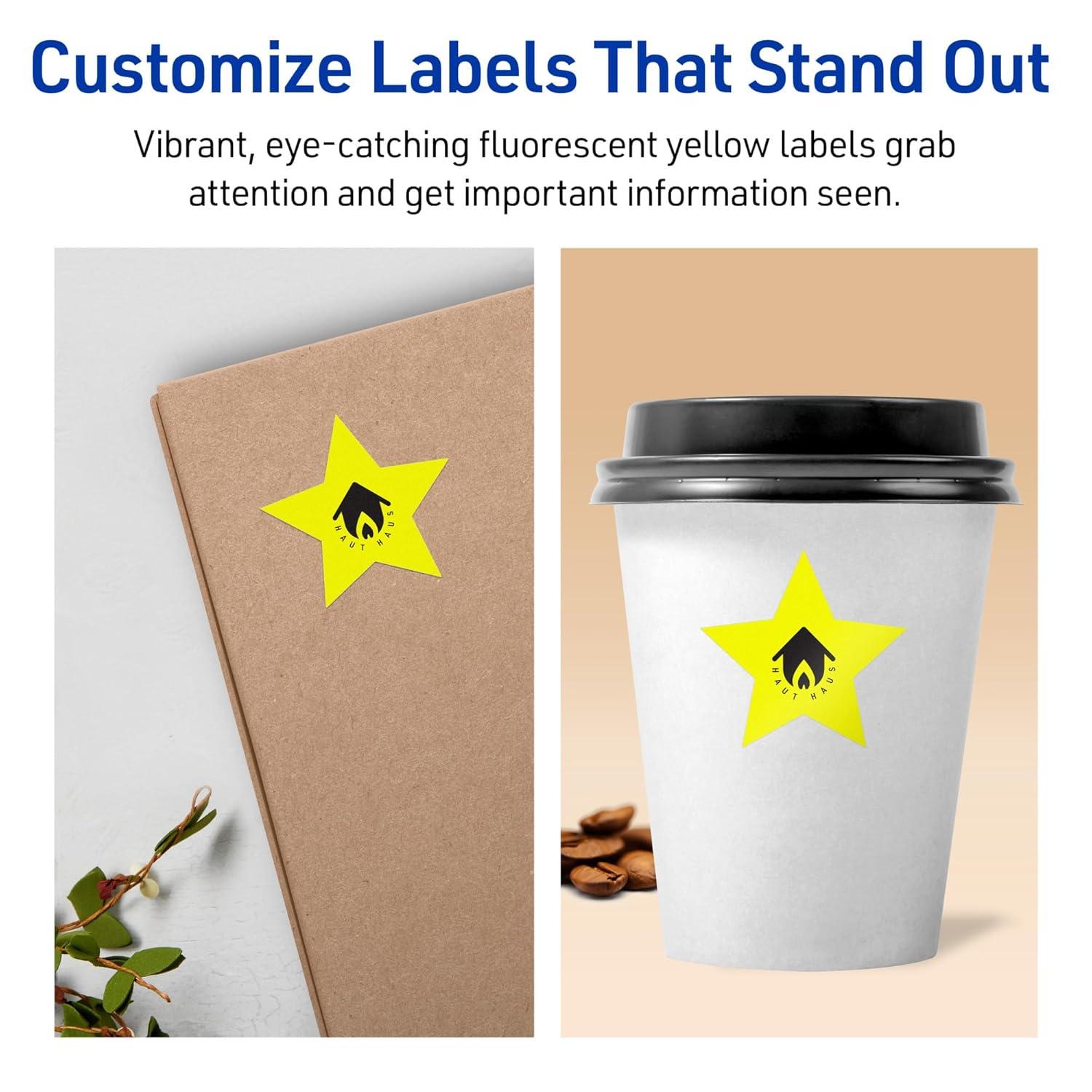 Design your own high-visibility labels with vibrant, bright colors with Avery Neon Yellow Star 2-1/4″ x 2-3/8″ Labels. Created with brilliantly eye-catching neon yellow label material, these vivid labels will immediately grab people's attention so that you can easily make your own reward stickers, decorative labels, mailing seals, packaging labels, planner stickers, and more! The fluorescent color is perfect whether you need to create warnings, organize inventory, or make sure your product labels stand out on a shelf. Colored labels also help you reduce printing costs by printing with black ink instead of printing color ink on white paper. Compatible with both laser and inkjet printers, these labels make it easy to design professional labels with your own home or office printer. The print-to-the-edge layout allows you to create full-bleed artwork that allows the bright label color to peek through gaps in your design and it also lets you add in borders that fill the edges without any empty spaces. Easily customize stickers, product labels, pricing labels, and more with your own logos, art, symbols, and messaging by using the templates and designs in Avery Design & Print on the Avery site.