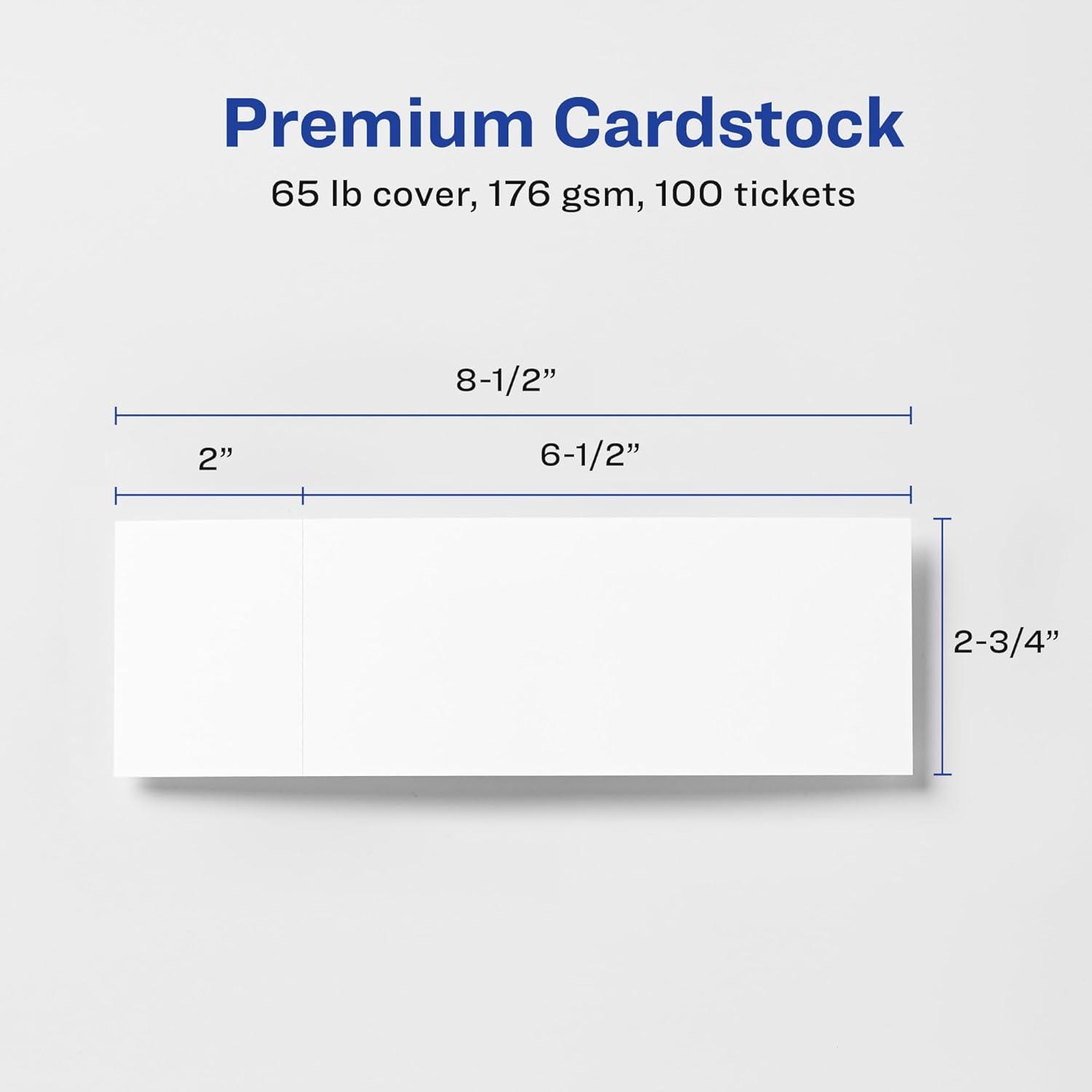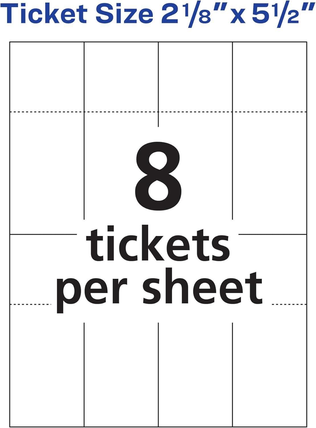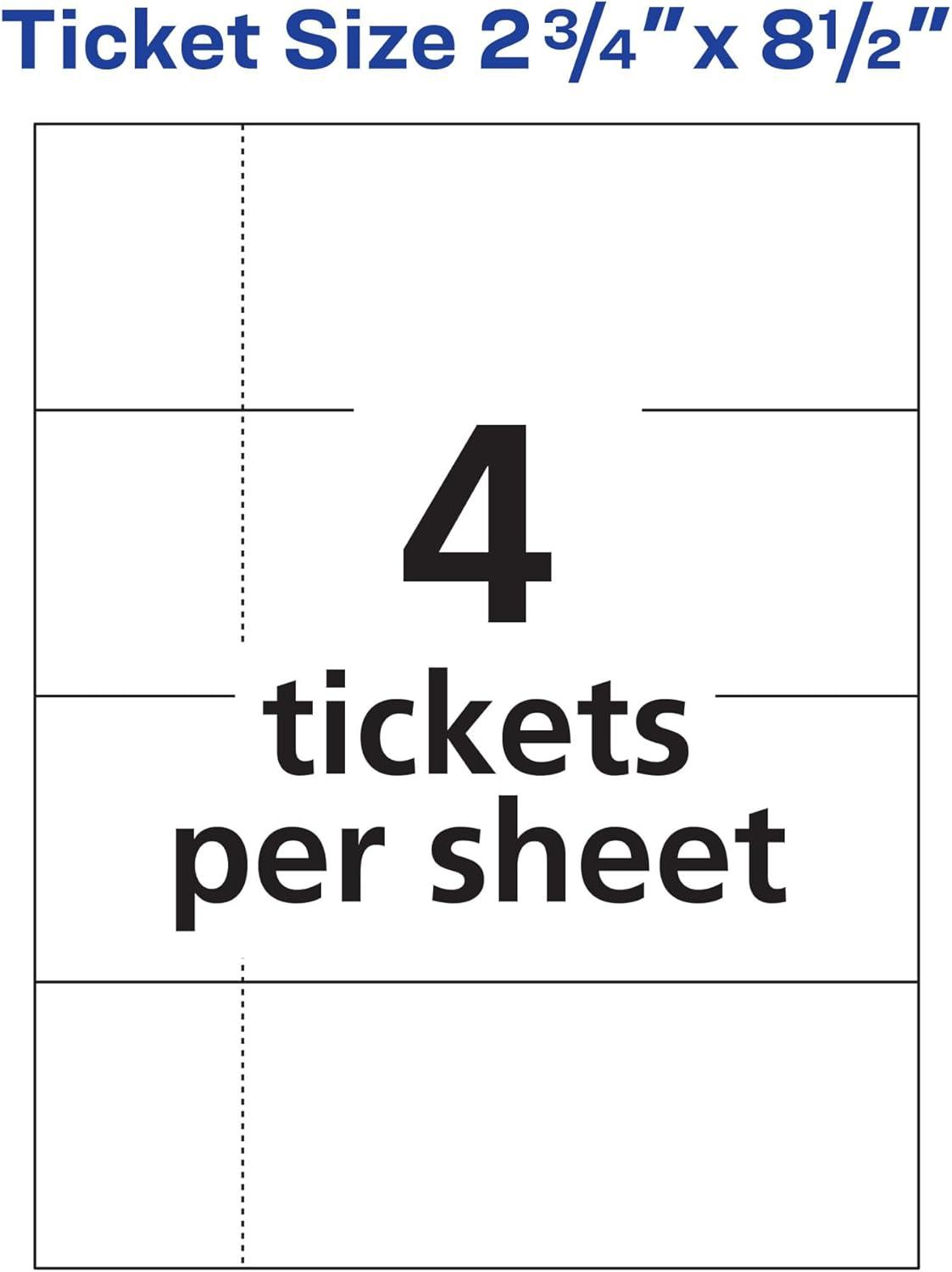 Make your next event extra special with Avery printable perforated tickets with stubs. With Avery tickets, you can easily print your own tickets from your home or office that look professionally printed. Ideal for printable raffle tickets, lottery tickets, drink tickets, concert tickets, diaper raffle tickets and more, these creative tickets are also great for crafting invitations, fundraising events, announcements, coupons and reminder cards. Each blank printable ticket and stub allows for your own new designs using Avery Design & Print Online. The intuitive Avery software also includes tools for creating sequential numbers, uploading images, personalizing text and much more. 100 tickets are included in total on 25 sheets with 4 tickets per sheet. The stub section measures 2-3/4″ x 2″ with the ticket section measuring 2-3/4″ x 6-1/2″. A strong perforation is used between each ticket and stub to leave a smooth edge for easy separation while ensuring the tickets are secure until the event.