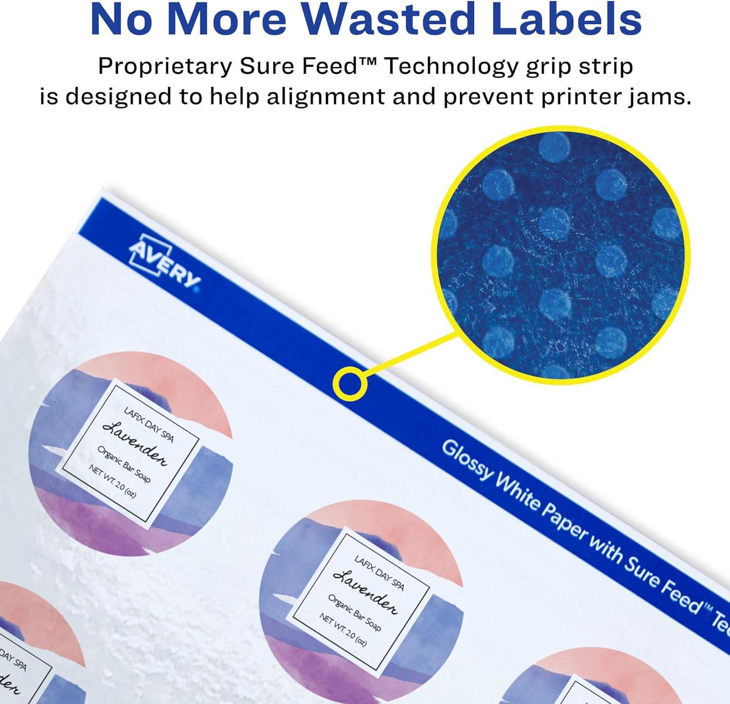 Create eye-catching labels for your products and projects with glossy white Avery round labels. This shiny label material will bring a premium touch to everything from hand sanitizer labels to labels for CBD & THC products to lip balm labels and much more. Each sheet of labels also features Sure Feed technology which helps deliver a more reliable feed through your printer to prevent print misalignments and paper jams. The print-to-the-edge label layout makes it easy to print beautiful designs that fill the entire label without a white border. A strong permanent adhesive is used to make sure that these labels stick and stay to paper, cardboard, plastic, glass, metal and more without curling or falling off. Compatible with both laser and inkjet printers. Avery Design & Print makes it easy to create customized labels from your own home or business. The free browser-based software has everything you need to design lip scrub labels, lotion labels and more. Try it out today on the Avery site.