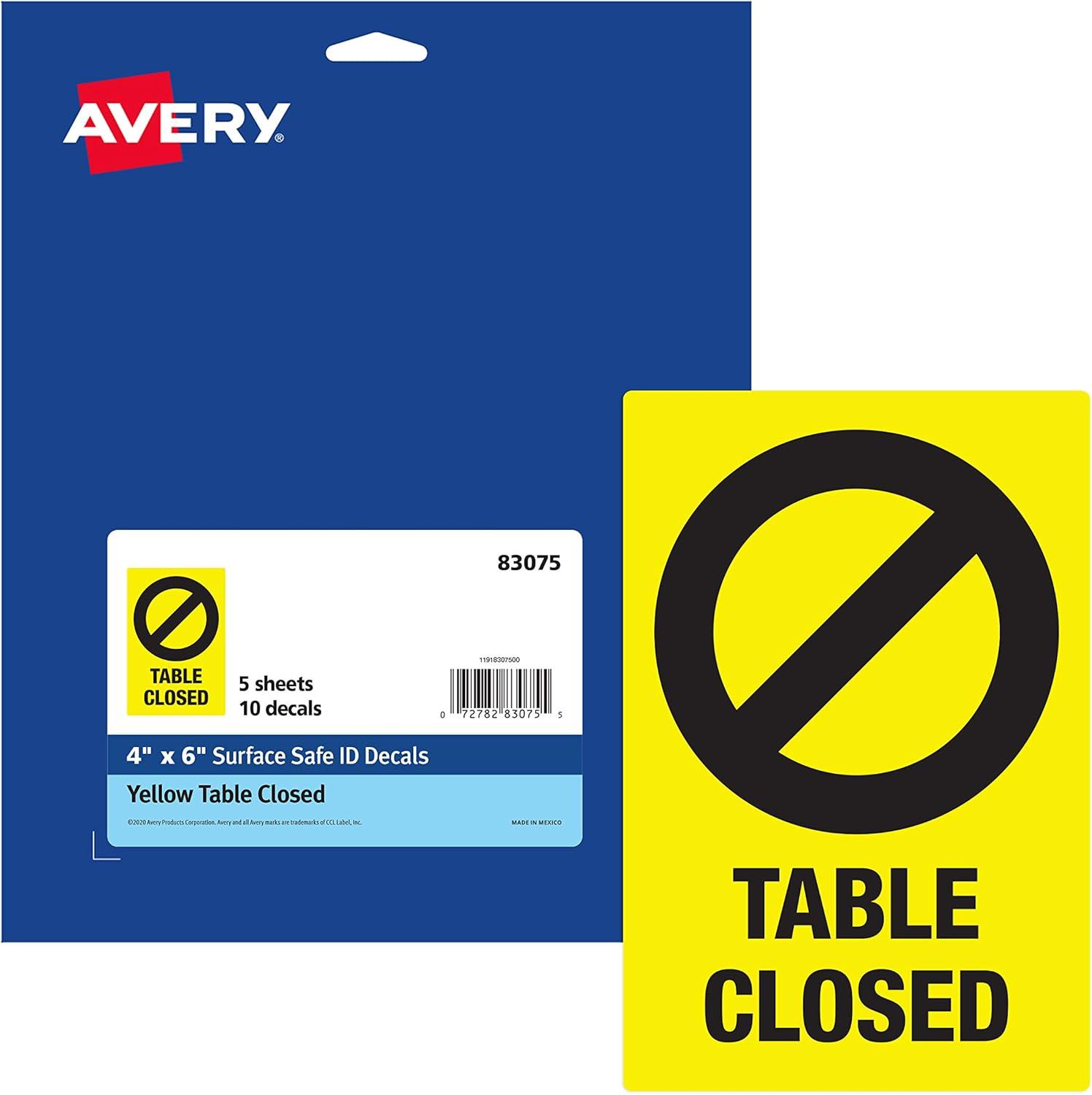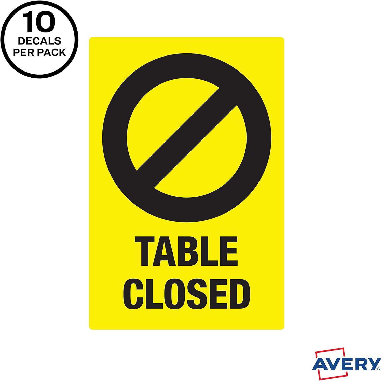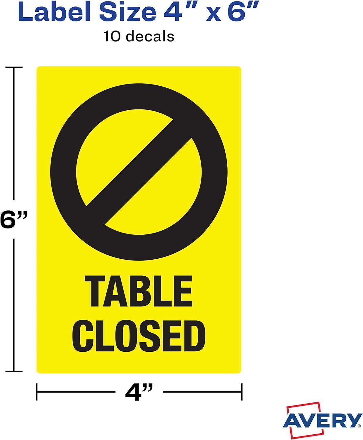 Avery Social Distancing Signs, Open/Closed, Green & Red, Surface Safe ID, 4" x 6", 10 Removable Decals (83070)(Yellow Table Closed)