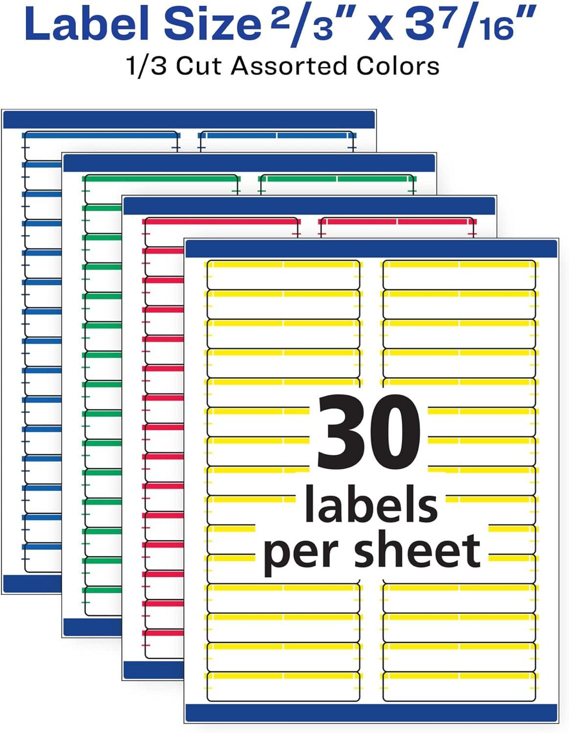 Make organizing your files, documents and binders a breeze with this colorful office solution that's here to stay. The bright colored strip on the top of these Avery file folder labels are perfect for color coding and quick file identification. With innovative TrueBlock® Technology, markings are completely covered, so your tab folder labels look neat and bright white every time. Lifting and curling are not a problem thanks to the permanent file folder labels self adhesive that guarantees your labels stick securely to smooth surfaces like paper, cardboard, plastic, wood, glass, metal and more. Write directly on tab folder labels or print at home in minutes using your laser or inkjet printer. Avoid printer misalignments and paper jams with our proprietary Sure Feed technology that provides a more reliable feed through your printer. Get free templates and designs on the Avery site to customize your labels. This item comes with 25 sheets for a total of 750 2/3” x 3-7/16” blue, green, red, white and yellow file folder labels.