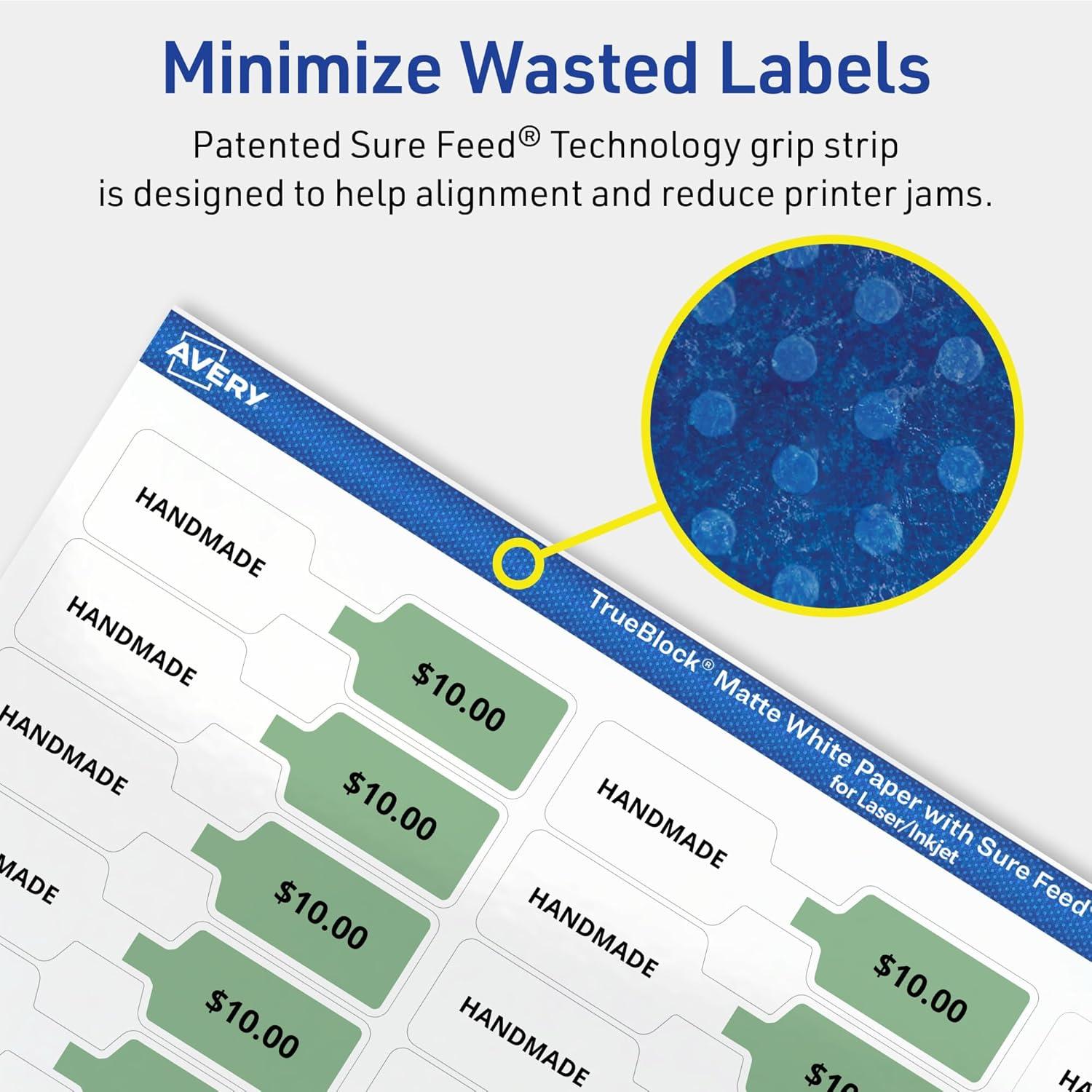 Avery labels with patented Sure Feed technology provide a more reliable feed through your printer, reducing misalignments and jams