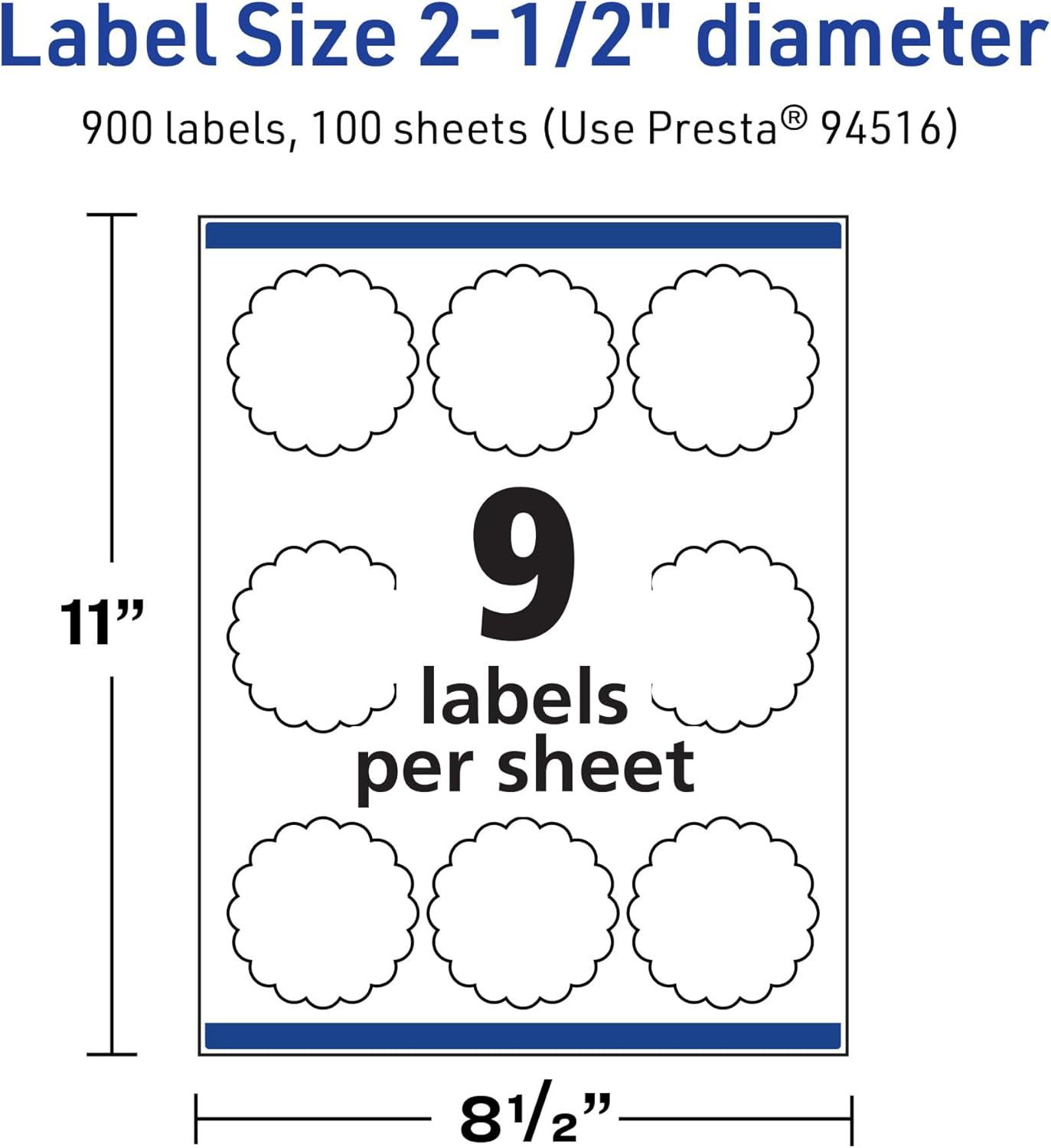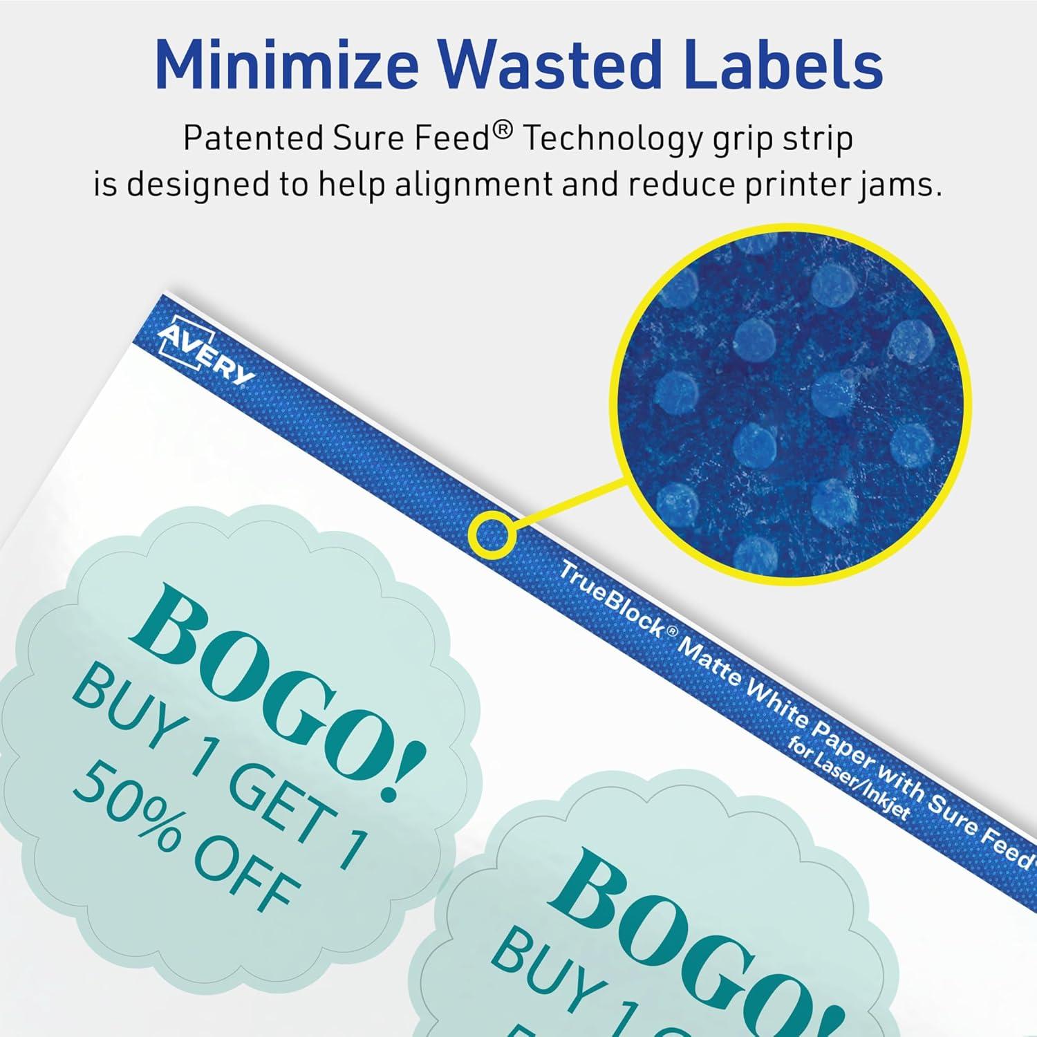 Easily update old information and create mailing seals, candle labels, soap labels, and more with Avery TrueBlock 2-1/2″ diameter Matte White Round Scalloped Labels. Easily revise old labels with Avery TrueBlock technology. The proprietary TrueBlock feature completely covers up markings and printing so that none of your old data shows through. This also provides better contrast for your new print to stand out on a completely white background. The permanent adhesive makes sure that your labels stick and stay to a variety of surfaces without peeling, curling, or falling off. Avery round scalloped labels are carefully constructed with top features to provide the best results. Sure Feed technology reduces jams and smudges by creating a more reliable feed through your printer. The print-to-the-edge layout lets you print beautiful full-bleed designs that fill each blank sticker to the edge. Easily customize product labels, round spice labels, mason jar labels, and more with your own art, symbols, and messaging by using the templates and designs on the Avery website.