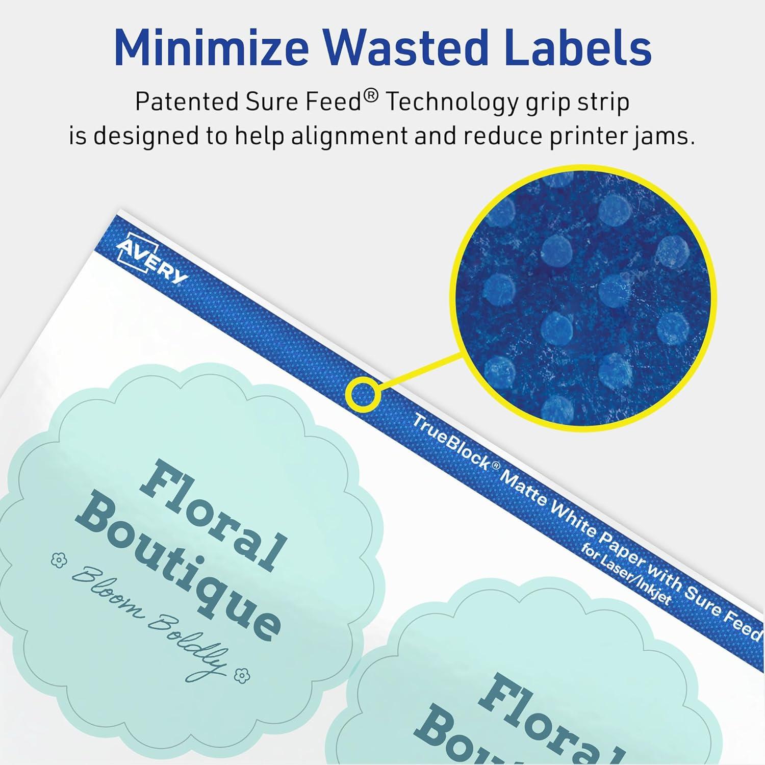 Avery TrueBlock Matte White Round Scalloped Labels, Sure Feed Technology, 2.5″ Diameter, 90 Matte White Labels, Print-To-The-Edge, Laser/Inkjet Printable, Great for Packaging and Product Merchandising(90 labels)