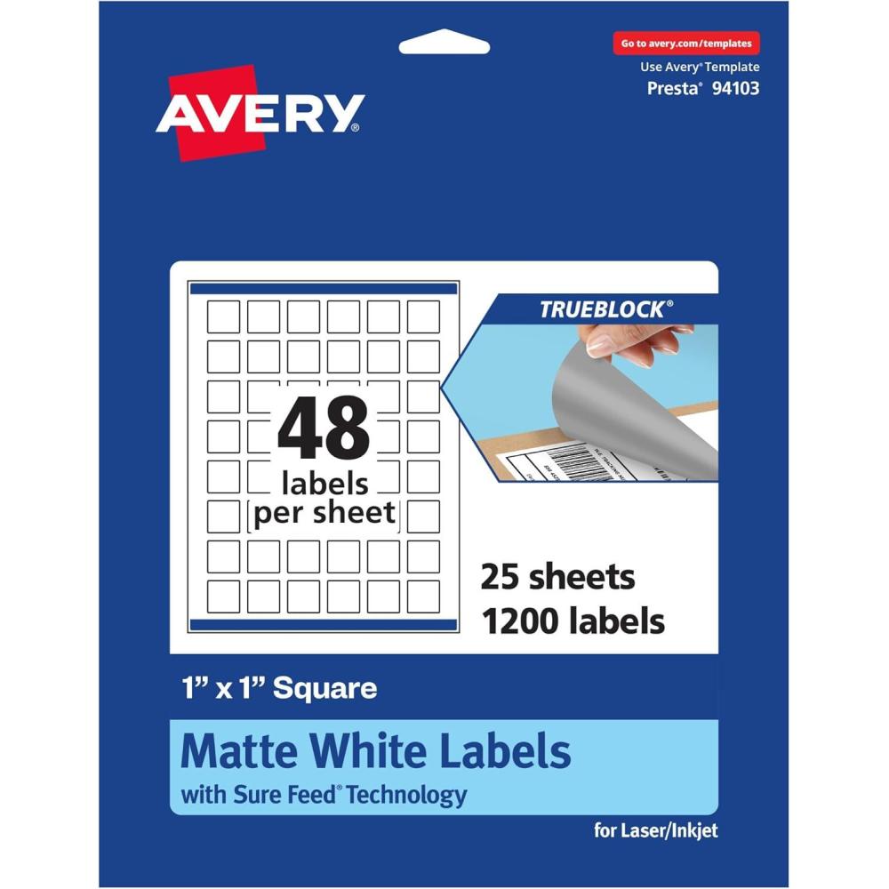 Avery TrueBlock Matte White Square Labels, Sure Feed Technology, 1" x 1", 480 Matte White Labels, Print-to-The-Edge, Laser/Inkjet Printable, Great for Product Merchandising Stickers(1 200 labels)