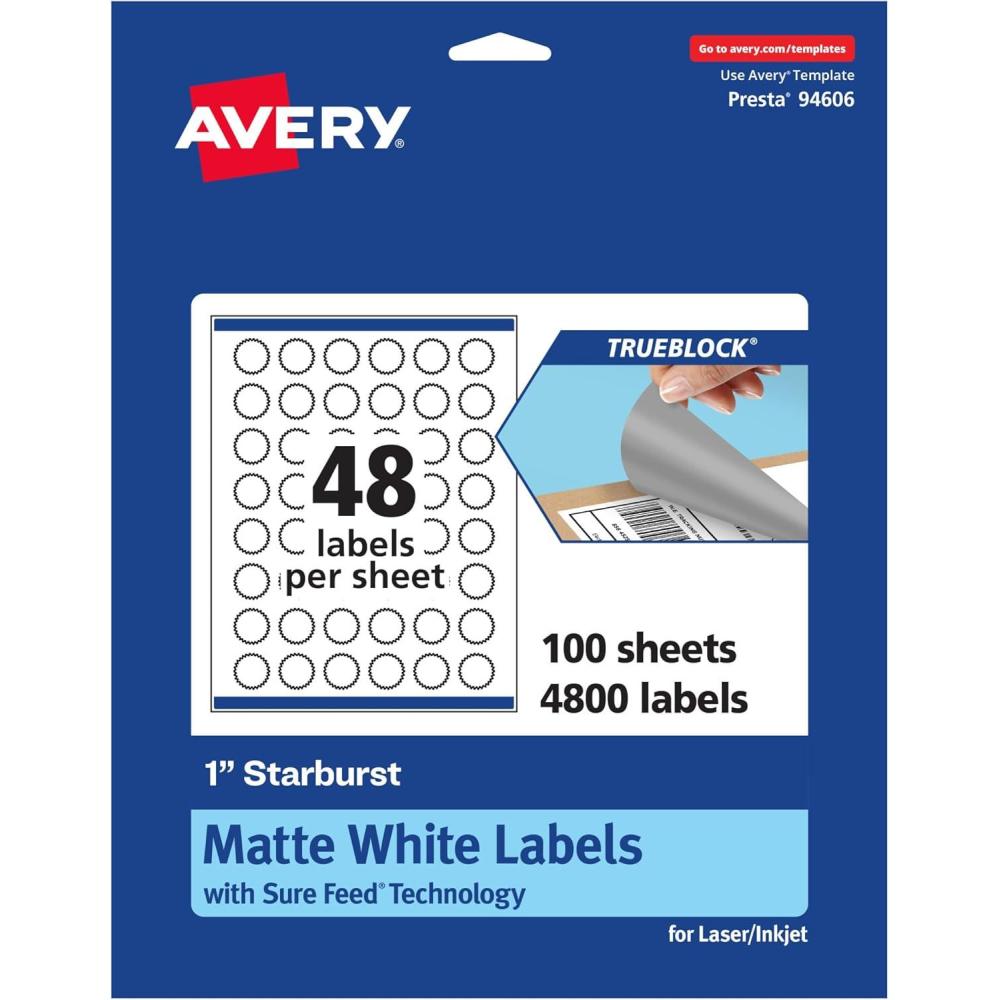 Avery TrueBlock Matte White Starburst Labels, Sure Feed Technology, 1″, 2,400 Matte White Labels, Print-to-The-Edge, Laser/Inkjet Printable, Great for Packaging and Product Merchandising(4 800 labels)