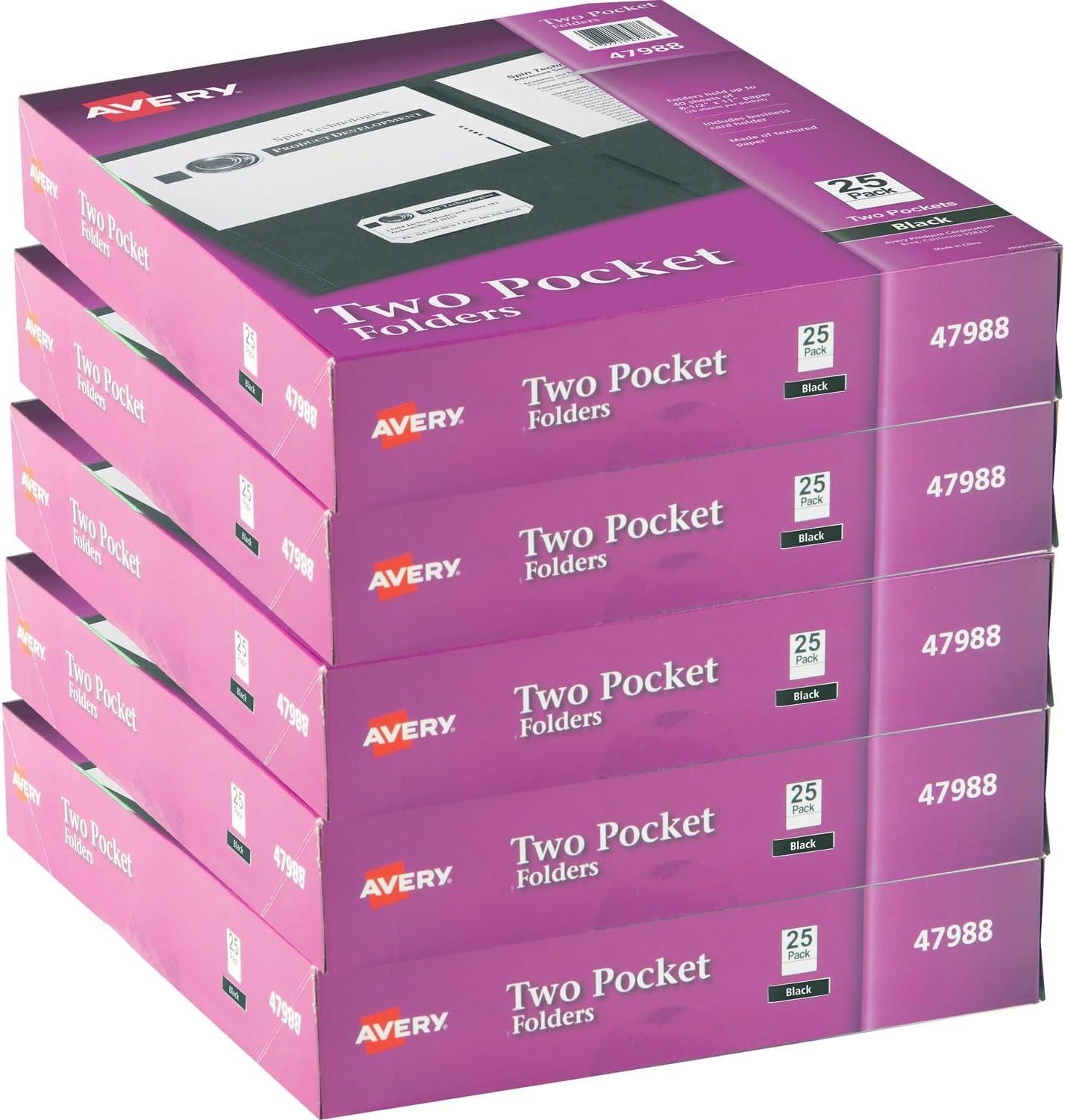 Keep your documents well organized and neat with this 25-pack of Avery 47985 Two Pocket Folders. These 8” x 11 ½” blue paper folders with pockets feature a matte finish and soft texture that helps hide marks and scuffs for a professional-looking presentation. Each folder includes two internal pockets designed to hold up to 20 pages per pocket, perfect for storing a variety of documents like homework assignments, study sheets, class notes, business brochures, coupons, and more. Whether you need folders for school to use for the upcoming semester, presentation folders for a trade show, or office folders to hold important project documents, these folders with pockets provide the convenience needed for easy organization. You can load and unload documents effortlessly, as each pocket corner includes built-in open side notches designed for easier access to your pages. You can also create a memorable first impression by writing on or adding a custom label to the cover of each paper folder. Plus, a die-cut card slot located on the inside front pocket allows you to insert your own business card for a personalized, professional touch. Ensure effortless paper organization and a polished presentation with two-pocket Avery folders.
