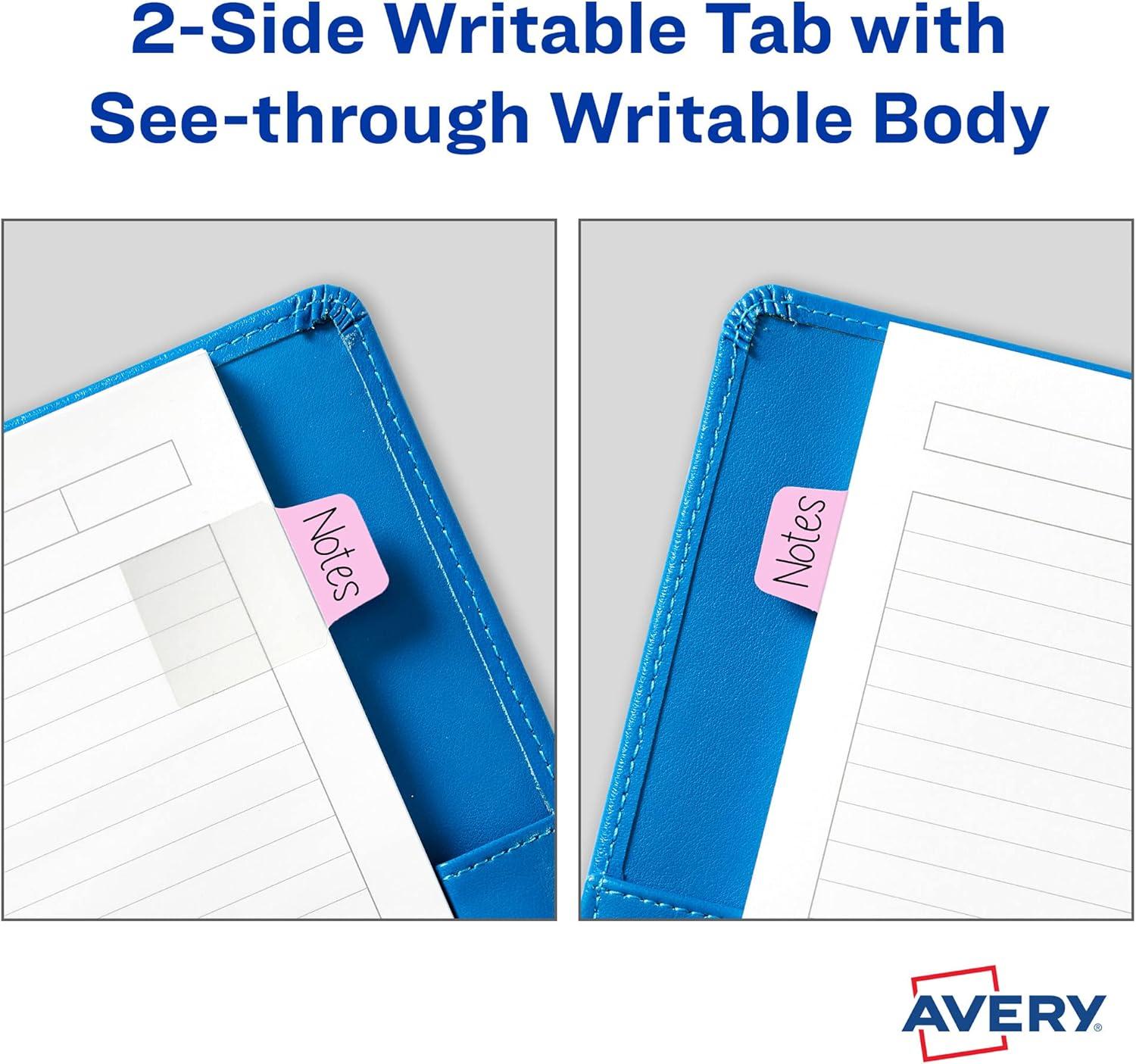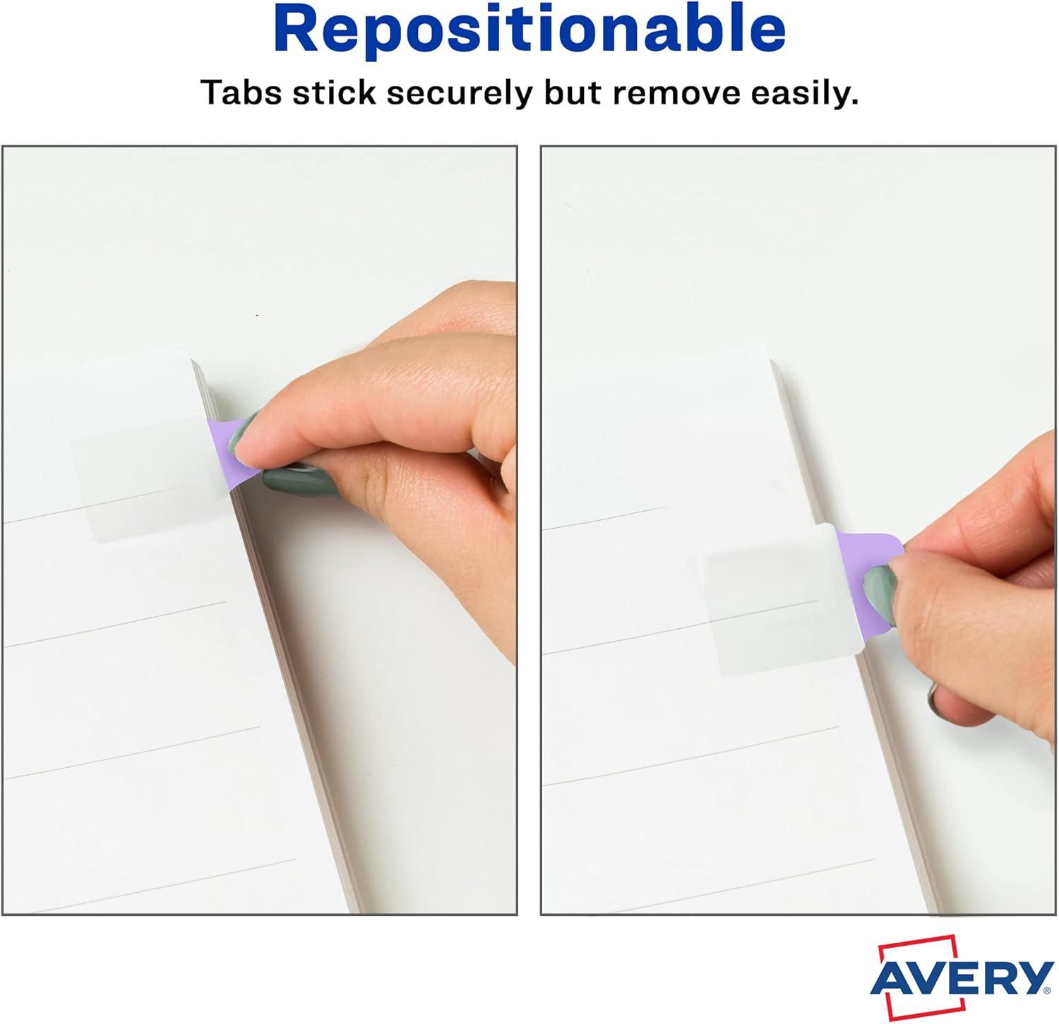 This 3-pack of Avery 34778 Mini Ultra Tabs are durable tabs that make indexing, flagging and referencing documents quick and easy with a smaller size that won’t get in the way of text or other tabs. The sturdy tabs are writable on both sides and the adhesive body is clear so you can see text underneath. You can write on these page tabs with most pens, pencils, markers and highlighters, and they're smudge free. The repositionable tabs stick securely and strongly enough to turn pages, yet remove easily without leaving residue or lifting ink.* Perfect for home organization; use these sticky tabs as page flags in magazines, bible tabs for passages or recipe index tabs in cookbooks. Students, teachers and administrators will find it easy to highlight textbooks and notes without marking the pages. At the office, make quick and easy sticky notes in your weekly or monthly planner and mark items in a report or presentation for referencing, follow-up or signatures. Each pack of 40 includes 10 pink, 10 purple, 10 green and 10 blue pastel tabs. *Please Note: Ink dry times may vary. Tab may lift some inks. Test before applying.