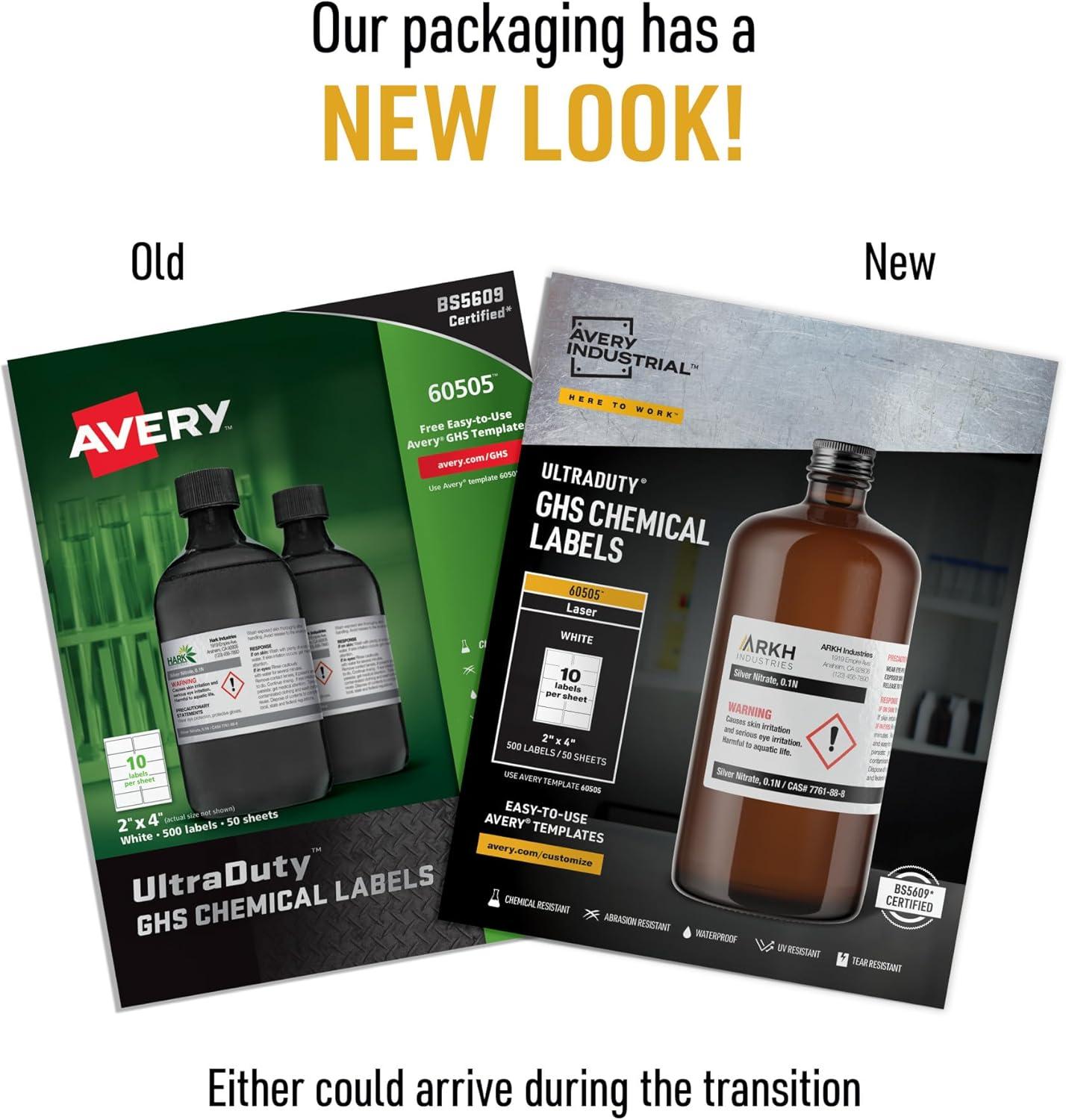 Avery UltraDuty GHS Chemical Labels for Laser Printers, Waterproof, UV Resistant, 2 x 4, 500 Pack (60505)(1 Pack)