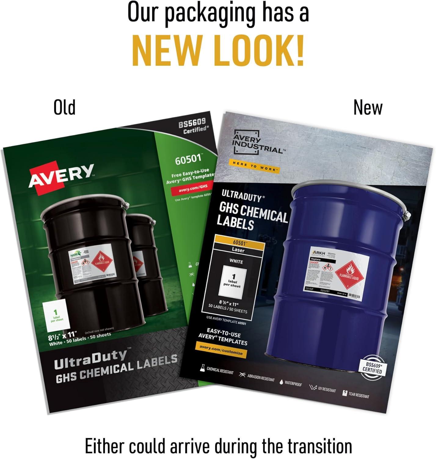 Get your organization's chemical labeling in compliance with the Globally Harmonized system (GHS). Avery Ultra duty GHS chemical labels are specifically designed to withstand chemicals, abrasion, sun, water and extreme temperatures. They resist tearing and scuffing, and stand up to frequent use. With high-performance adhesive, the durable labels pass the BS5609 Protocol for 90-day seawater immersion. Ideal for labeling for drums, pails and totes. Easily customize and Print your required labels on demand using free Avery design & Print online. Take advantage of our ready-to-use free templates, or design your GHS labels step-by-step with the Avery GHS Wizard. Labels can be printed using standard sheet-fed laser printers. Customize labels with your company logo, lot numbers, barcodes or other information, and update as needed.