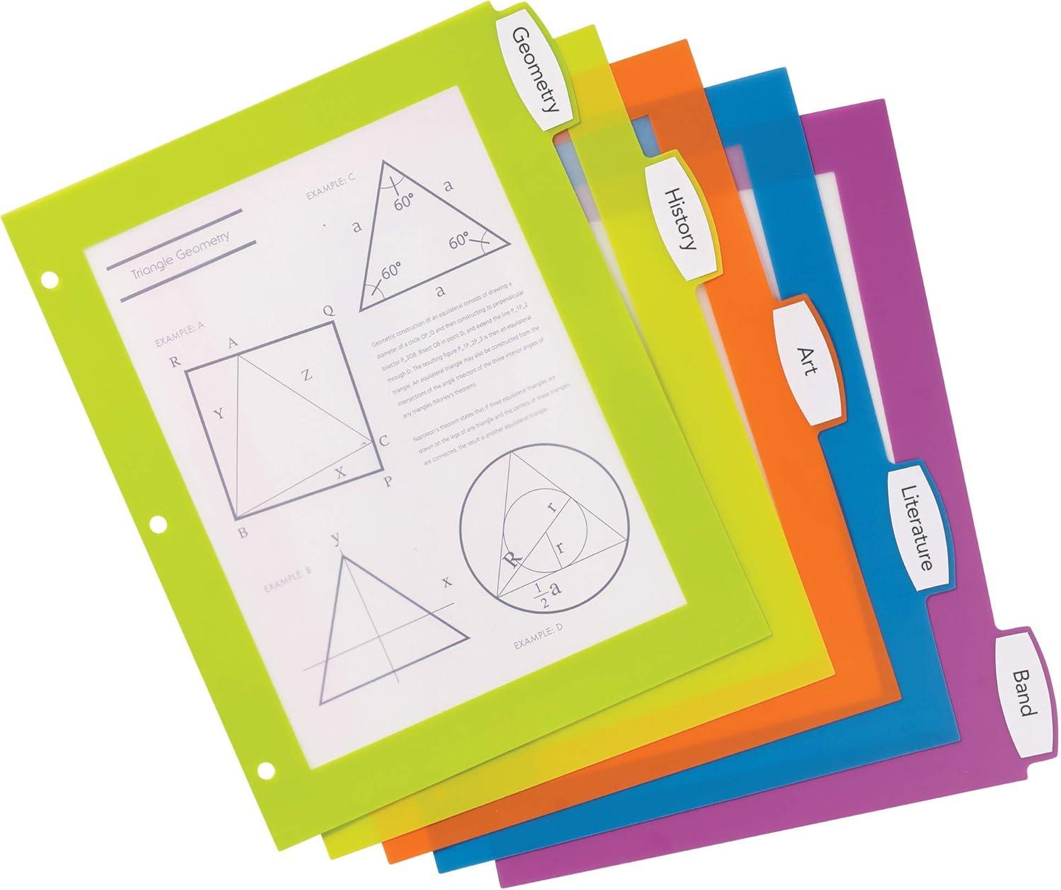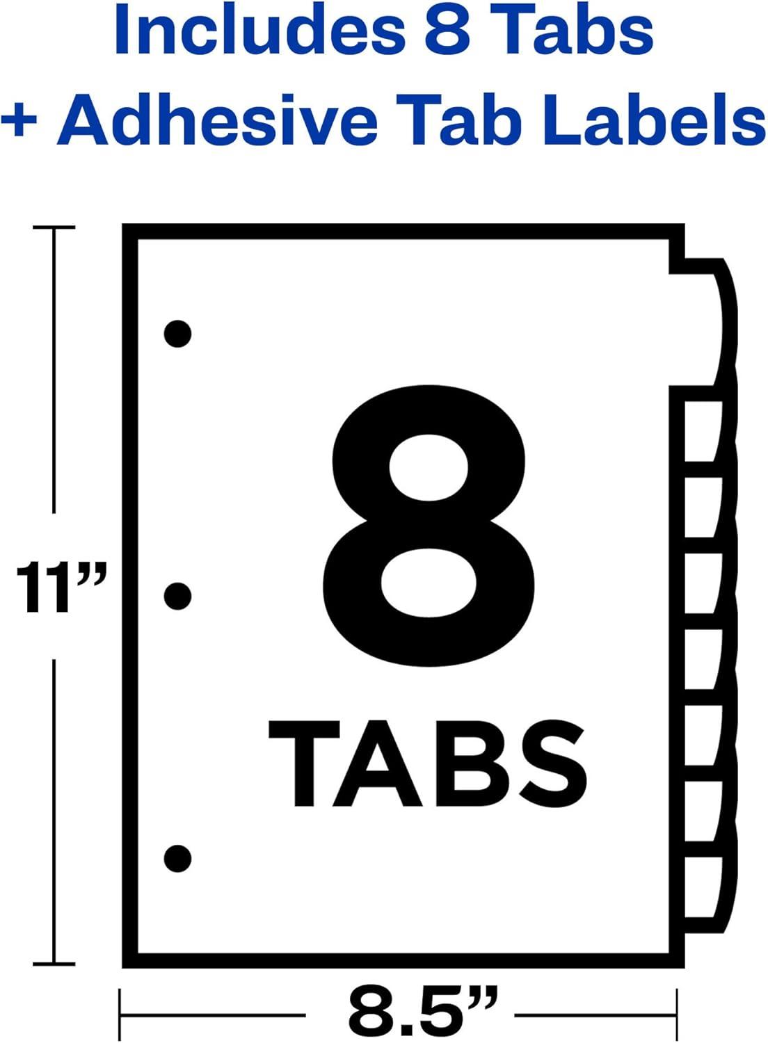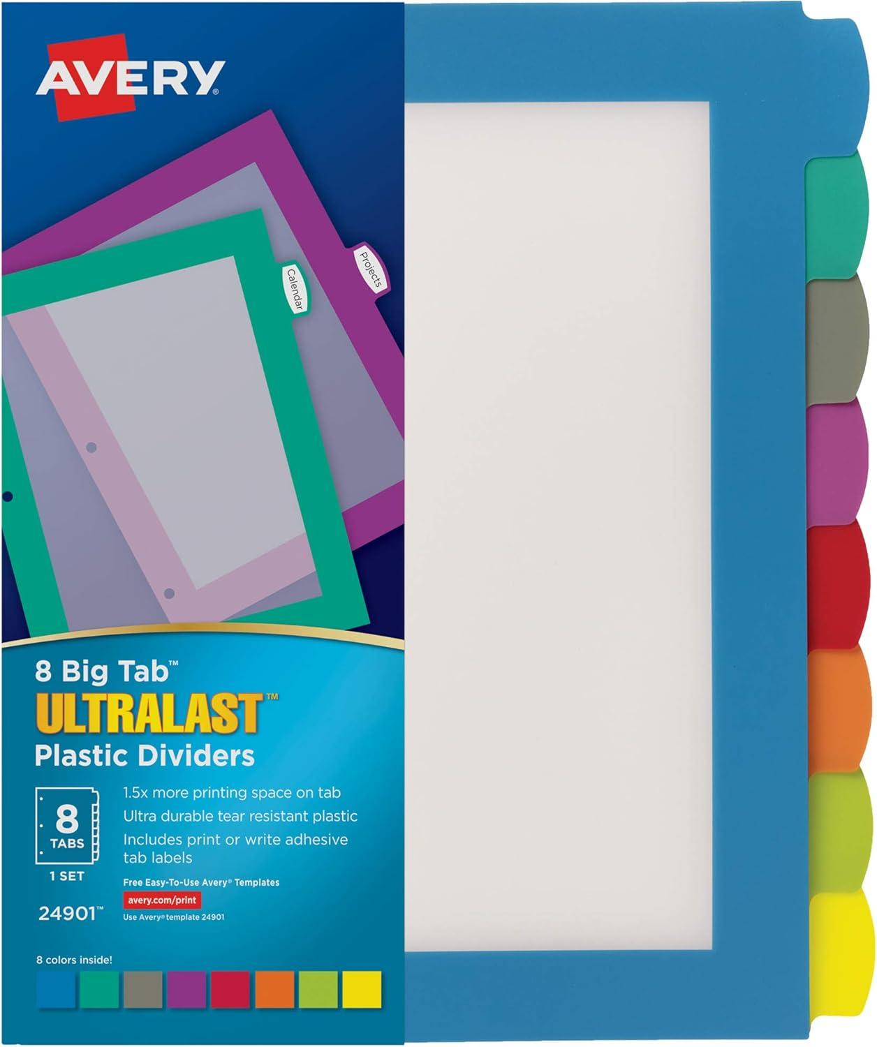 These durable Avery dividers are made of ultra-tough, tear-resistant plastic. They offer 1.5 times more space for printing on the tab compared to standard ones. A see-through window allows for easy referencing. The pack includes printable or write-on adhesive tab labels and features five vibrant border designs. You can personalize your tab labels using free fonts, templates, and designs at avery.com/print. Ideal for use at school, home, or work, these dividers are three-hole punched and ready to use.