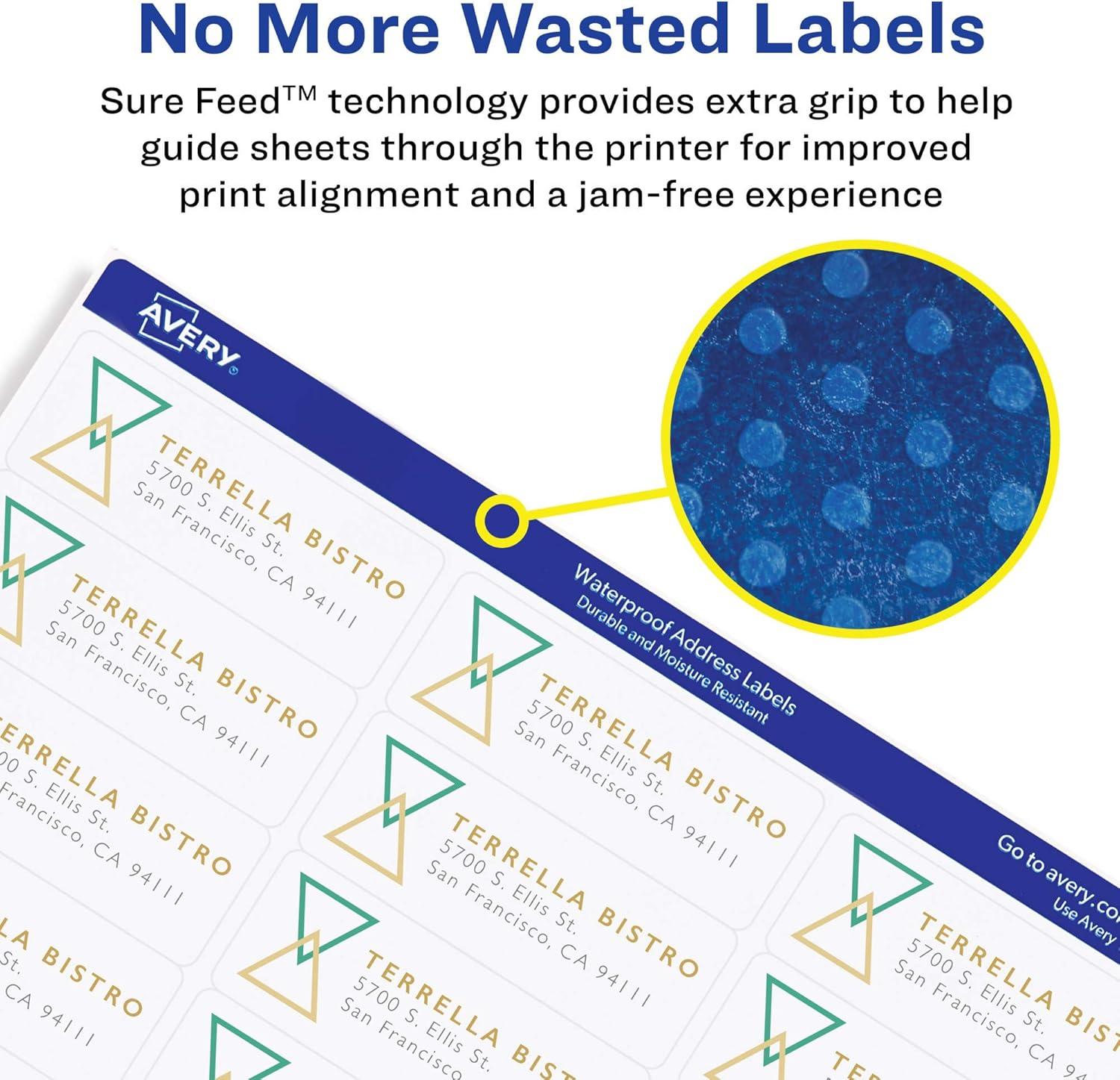 Make sure you're using the most secure labels with Avery mailing labels with Ultrahold permanent adhesive. Avery Ultrahold adhesive sticks and stays better than other basic labels on a variety of surfaces including envelopes, cardboard, paper, plastic, glass, tin and metal. Proprietary Avery Sure Feed label technology helps deliver a more reliable feed through your printer to prevent print misalignments and paper jams. Created with TrueBlock label material, these address labels will completely hide everything underneath so that you can cover older information and reuse old envelopes and packaging. These 1-1/3″ x 4″ rectangle labels are also completely waterproof and will stay intact even when submerged in water. They are great for food applications as they are temperature resistant and acceptable for food contact. Great for product labels as they can reach grade A barcode readability and can withstand damage from scuffing, tearing, smudging and up to a year of UV light outdoors. They are also chemical resistant, making them easy to wipe clean with multipurpose cleaners and disinfecting wipes. Avery Design & Print makes it easy to create customized labels from your own home or business. The browser-based software has everything you need to design labels for food containers, essential oils labels, lip gloss labels, lip balm labels and more. Try out our templates and designs on Avery Design & Print Online today! Please note that waterproof printable labels are only compatible with laser printers.