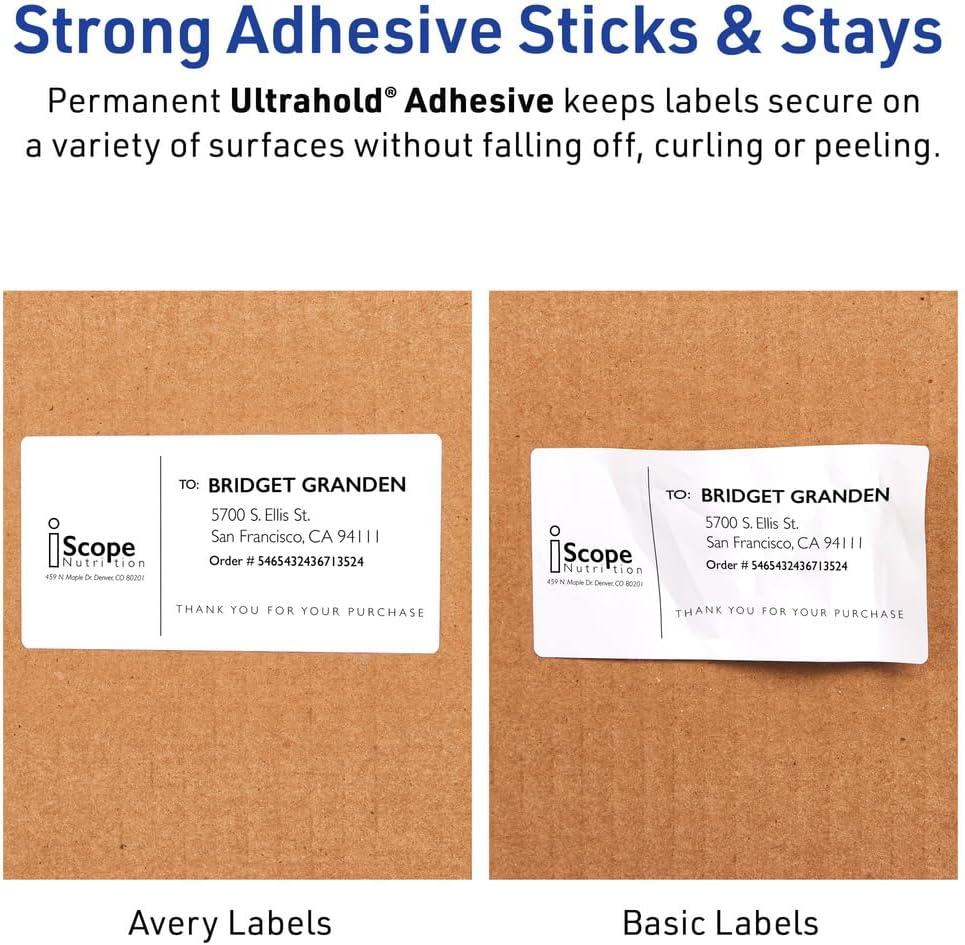 Make sure you're using the most secure labels with Avery mailing labels with Ultrahold permanent adhesive. Avery Ultrahold adhesive sticks and stays better than other basic labels on a variety of surfaces including envelopes, cardboard, paper, plastic, glass, tin and metal. Created with TrueBlock label material, these shipping labels will completely hide everything underneath so that you can cover older information and reuse old boxes and packaging. These 5-1/2″ x 8-1/2″ rectangle labels are also completely waterproof and will stay intact even when submerged in water. They are great for food applications as they are temperature resistant and acceptable for food contact. Great for product labels as they can reach grade A barcode readability and can withstand damage from scuffing, tearing, smudging and up to a year of UV light outdoors. They are also chemical resistant, making them easy to wipe clean with multipurpose cleaners and disinfecting wipes. Avery Design & Print makes it easy to create customized labels from your own home or business. The browser-based software has everything you need to design labels for food containers, shipping labels, beauty sticker labels, medical labels and more. Try out our templates and designs on Avery Design & Print Online today! Please note that waterproof printable labels are only compatible with laser printers.