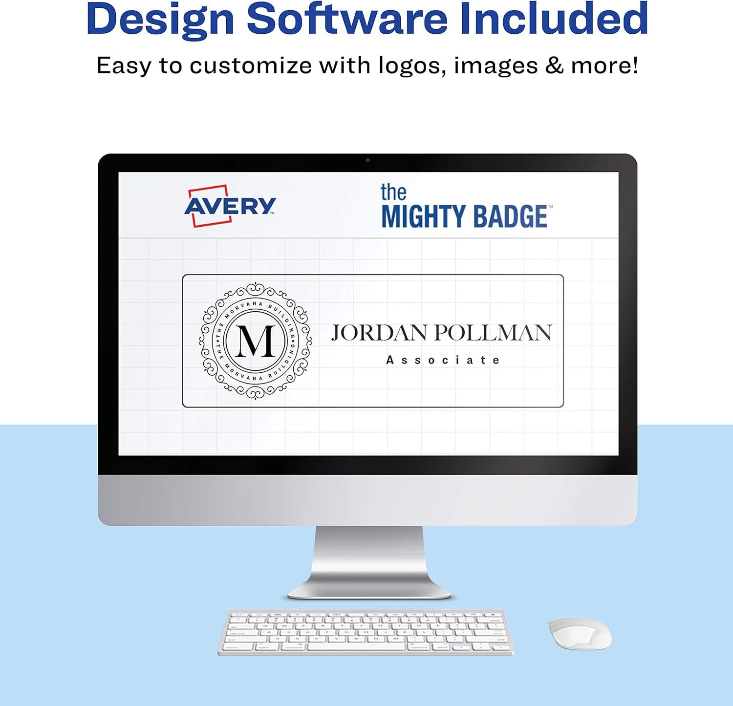 The Mighty Badge by Avery Reusable Professional Name Badge System makes it a snap to create magnetic name tags on demand. This complete system includes 50 silver-colored steel plates, 50 durable name badge magnet fasteners, 50 crystal clear lens covers, 60 clear inserts and 60 white inserts. The peel-off insert sheet is specially designed for multiple uses and reusability. Print off as many tags as you need and save the rest of the sheet to print later. Once the inserts are ready, just place them over the metal backing plate and lock the shatter-resistant lens cover into place. Each pack also includes a free access code for the Mighty Badge design software. This graphic design software is uniquely designed to work alongside the Mighty Badge system and gives you the ability to add logos, images, text, barcodes and more. Redeem your code online at imprintplus.com/avery These durable, professional 1 x 3 name tags enable your team, company or organization to present a professional brand image and creates a welcoming, personal connection with the public. Please Note: The printable inserts in this pack are optimized for laser printers and are not recommended for use with inkjet printers.